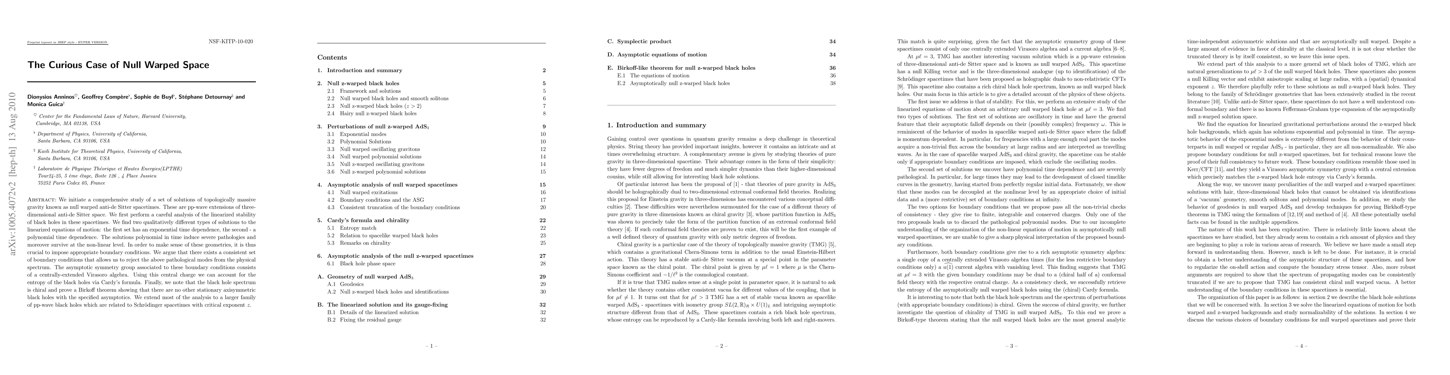We initiate a comprehensive study of a set of solutions of topologically massive gravity known as null warped anti-de Sitter spacetimes. These are pp-wave extensions of three-dimensional anti-de Sitter space. We first perform a careful analysis of the linearized stability of black holes in these spacetimes. We find two qualitatively different types of solutions to the linearized equations of motion: the first set has an exponential time dependence, the second - a polynomial time dependence. The solutions polynomial in time induce severe pathologies and moreover survive at the non-linear level. In order to make sense of these geometries, it is thus crucial to impose appropriate boundary conditions. We argue that there exists a consistent set of boundary conditions that allows us to reject the above pathological modes from the physical spectrum. The asymptotic symmetry group associated to these boundary conditions consists of a centrally-extended Virasoro algebra. Using this central charge we can account for the entropy of the black holes via Cardy's formula. Finally, we note that the black hole spectrum is chiral and prove a Birkoff theorem showing that there are no other stationary axisymmetric black holes with the specified asymptotics. We extend most of the analysis to a larger family of pp-wave black holes which are related to Schr\"odinger spacetimes with critical exponent z.