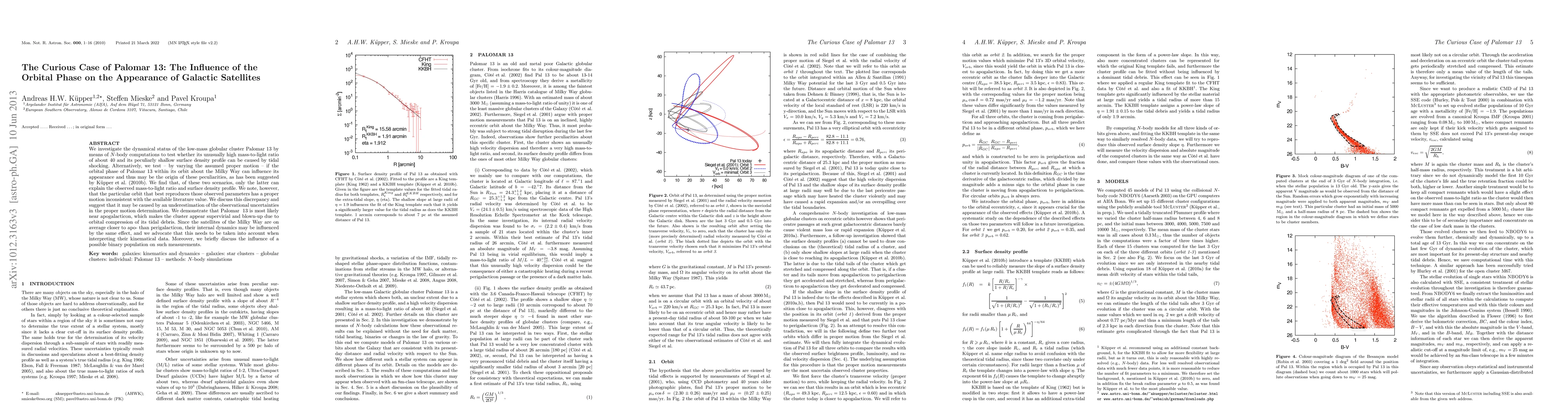 We investigate the dynamical status of the low-mass globular cluster Palomar 13 by means of N-body computations to test whether its unusually high mass-to-light ratio of about 40 and its peculiarly shallow surface density profile can be caused by tidal shocking. Alternatively, we test - by varying the assumed proper motion - if the orbital phase of Palomar 13 within its orbit about the Milky Way can influence its appearance and thus may be the origin of these peculiarities, as has been suggested by Kuepper et al. (2010). We find that, of these two scenarios, only the latter can explain the observed mass-to-light ratio and surface density profile. We note, however, that the particular orbit that best reproduces those observed parameters has a proper motion inconsistent with the available literature value. We discuss this discrepancy and suggest that it may be caused by an underestimation of the observational uncertainties in the proper motion determination. We demonstrate that Palomar 13 is most likely near apogalacticon, which makes the cluster appear supervirial and blown-up due to orbital compression of its tidal debris. Since the satellites of the Milky Way are on average closer to apo- than perigalacticon, their internal dynamics may be influenced by the same effect, and we advocate that this needs to be taken into account when interpreting their kinematical data. Moreover, we briefly discuss the influence of a possible binary population on such measurements.