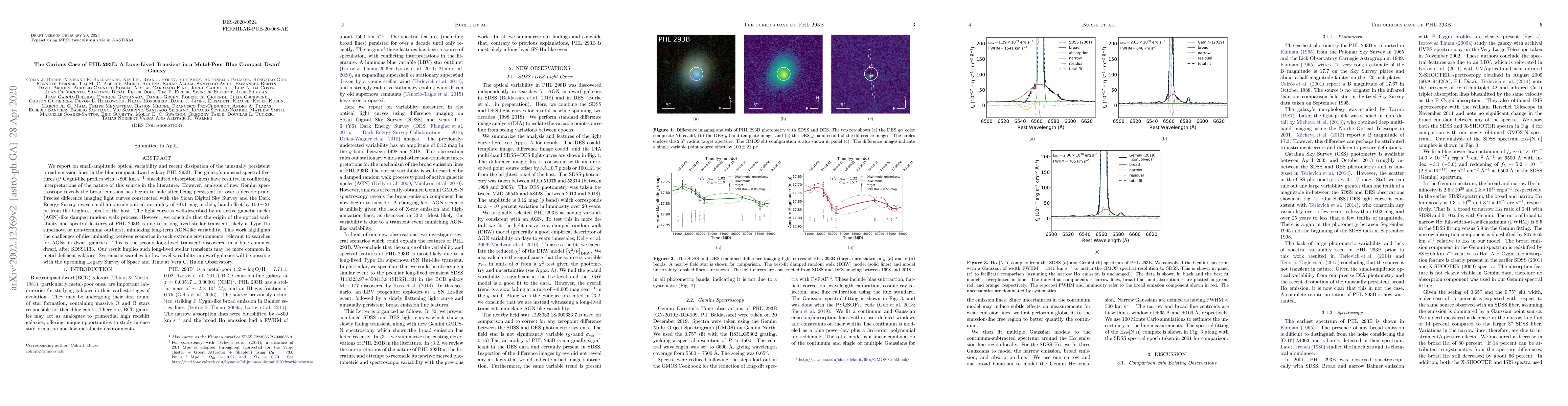 This paper investigates the persistent broad emission lines in the metal-poor blue compact dwarf galaxy PHL 293B, revealing their recent dissipation and small-amplitude optical variability. The study concludes that the spectral features likely result from a long-lived stellar transient, such as a Type IIn supernova, rather than an active galactic nucleus, highlighting the complexities in identifying AGNs in such environments.