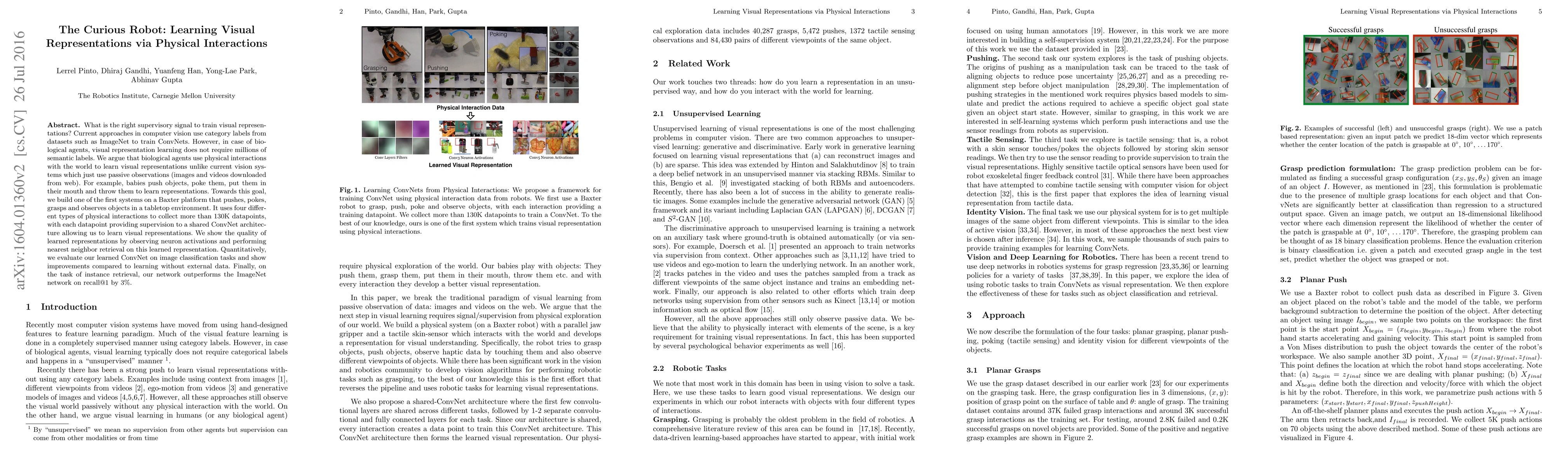 What is the right supervisory signal to train visual representations? Current approaches in computer vision use category labels from datasets such as ImageNet to train ConvNets. However, in case of biological agents, visual representation learning does not require millions of semantic labels. We argue that biological agents use physical interactions with the world to learn visual representations unlike current vision systems which just use passive observations (images and videos downloaded from web). For example, babies push objects, poke them, put them in their mouth and throw them to learn representations. Towards this goal, we build one of the first systems on a Baxter platform that pushes, pokes, grasps and observes objects in a tabletop environment. It uses four different types of physical interactions to collect more than 130K datapoints, with each datapoint providing supervision to a shared ConvNet architecture allowing us to learn visual representations. We show the quality of learned representations by observing neuron activations and performing nearest neighbor retrieval on this learned representation. Quantitatively, we evaluate our learned ConvNet on image classification tasks and show improvements compared to learning without external data. Finally, on the task of instance retrieval, our network outperforms the ImageNet network on recall@1 by 3%