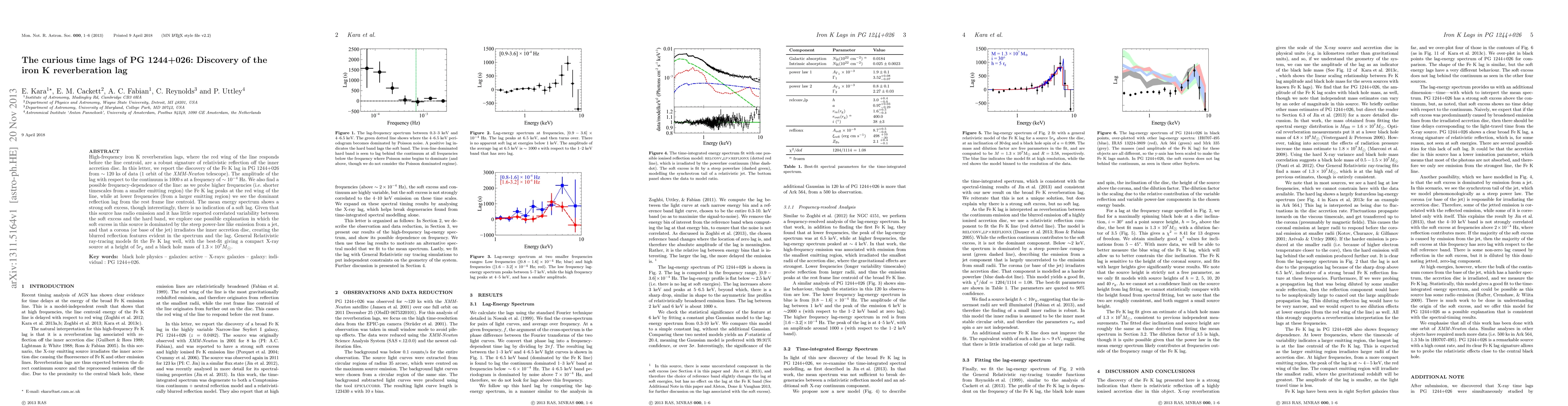 High-frequency iron K reverberation lags, where the red wing of the line responds before the line centroid, are a robust signature of relativistic reflection off the inner accretion disc. In this letter, we report the discovery of the Fe K lag in PG 1244+026 from ~120 ks of data (1 orbit of the XMM-Newton telescope). The amplitude of the lag with respect to the continuum is 1000 s at a frequency of ~1e-4 Hz. We also find a possible frequency-dependence of the line: as we probe higher frequencies (i.e. shorter timescales from a smaller emitting region) the Fe K lag peaks at the red wing of the line, while at lower frequencies (from a larger emitting region) we see the dominant reflection lag from the rest frame line centroid. The mean energy spectrum shows a strong soft excess, though interestingly, there is no indication of a soft lag. Given that this source has radio emission and it has little reported correlated variability between the soft excess and the hard band, we explore one possible explanation in which the soft excess in this source is dominated by the steep power-law like emission from a jet, and that a corona (or base of the jet) irradiates the inner accretion disc, creating the blurred reflection features evident in the spectrum and the lag. General Relativistic ray-tracing models fit the Fe K lag well, with the best-fit giving a compact X-ray source at a height of 5 gravitational radii and a black hole mass of 1.3e7 Msun.