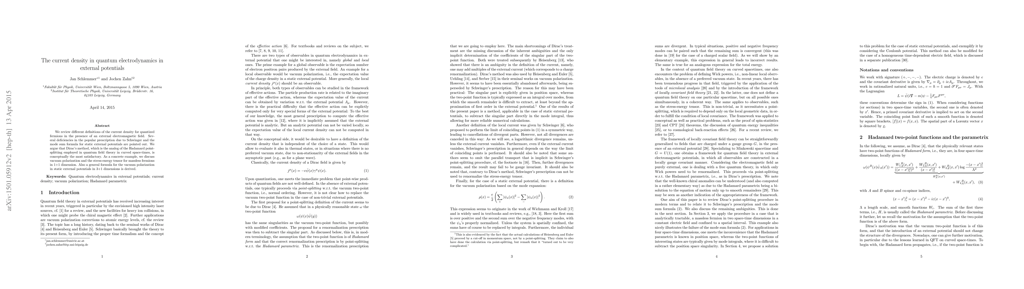 This paper reviews various definitions of current density in quantum electrodynamics with external electromagnetic fields, highlighting flaws in existing methods and advocating for Dirac's approach. It also derives a general formula for vacuum polarization in static potentials and examines the stress-energy tensor for massless fermions in lower dimensions.