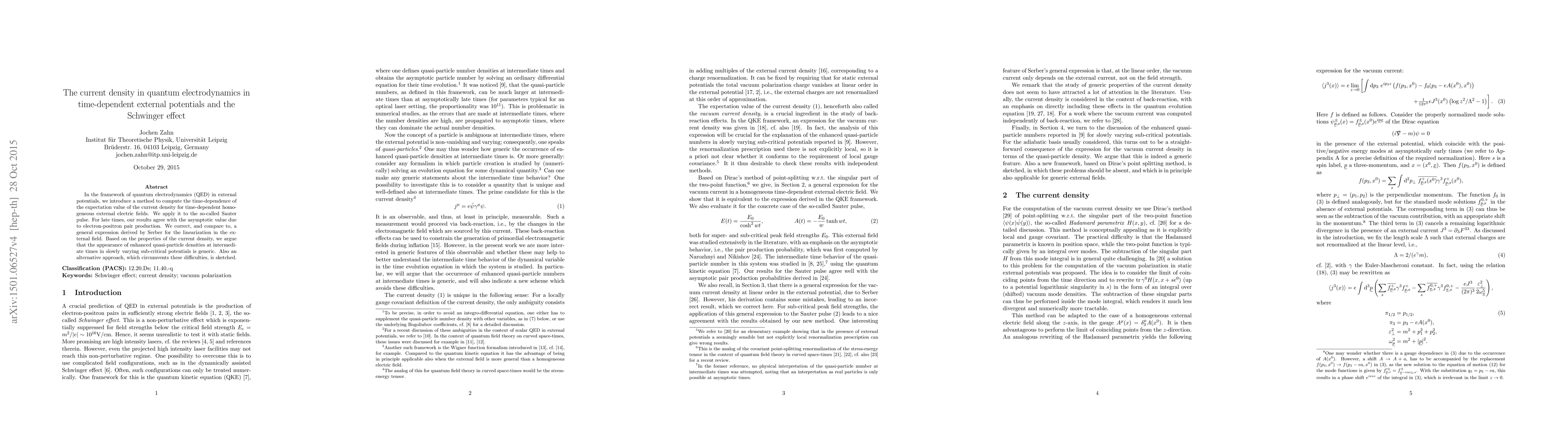 This paper develops a method to compute the time-dependent current density in quantum electrodynamics under time-varying external electric fields, specifically for the Sauter pulse, and confirms the asymptotic pair production value. It also corrects and compares to Serber's linearization expression and discusses the generic occurrence of enhanced quasi-particle densities in sub-critical potentials.