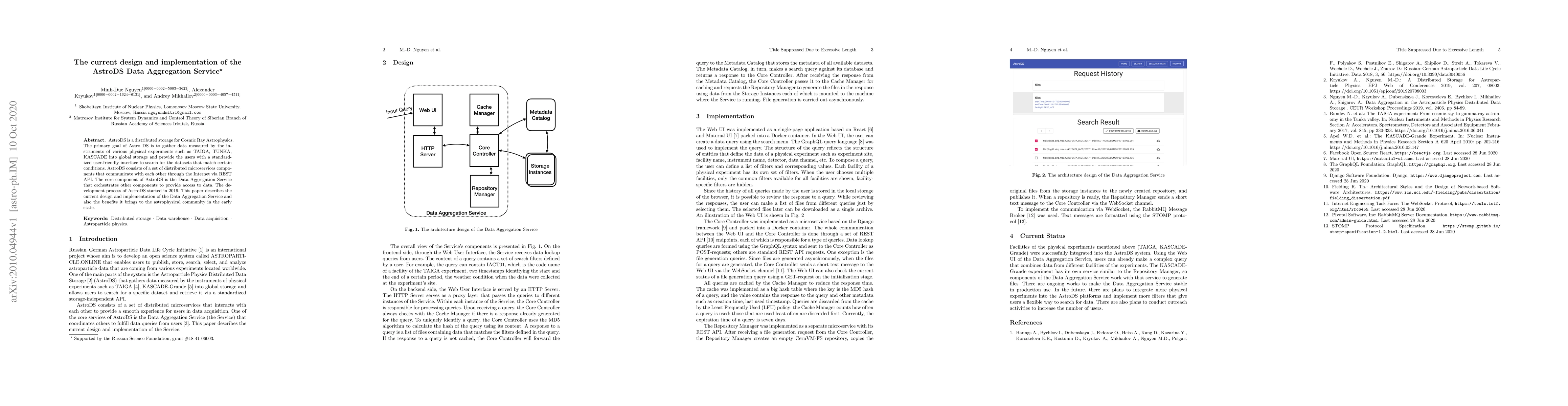 The paper describes the current design and implementation of AstroDS's Data Aggregation Service, a distributed system providing access to cosmic ray astrophysics data, and its benefits for the scientific community.