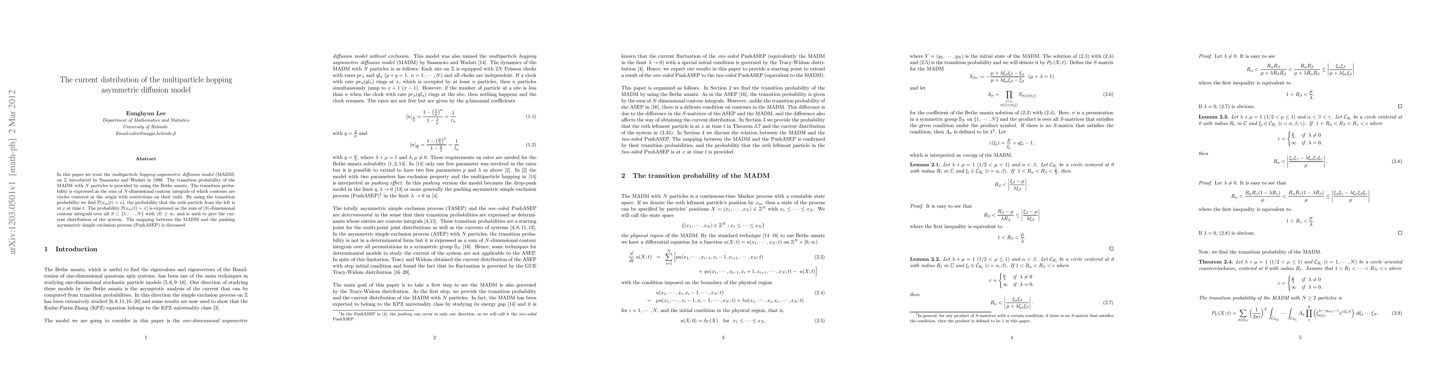 In this paper we treat the \textit{multiparticle hopping asymmetric diffusion model} (MADM) on $\mathbb{Z}$ introduced by Sasamoto and Wadati in 1998. The transition probability of the MADM with $N$ particles is provided by using the Bethe ansatz. The transition probability is expressed as the sum of $N$-dimensional contour integrals of which contours are circles centered at the origin with restrictions on their radii. By using the transition probability we find $\mathbb{P}(x_m(t) =x)$, the probability that the $m$th particle from the left is at $x$ at time $t$. The probability $\mathbb{P}(x_m(t) =x)$ is expressed as the sum of $|S|$-dimensional contour integrals over all $S \subset \{1,...,N\}$ with $|S| \geq m$, and is used to give the current distribution of the system. The mapping between the MADM and the pushing asymmetric simple exclusion process (PushASEP) is discussed.