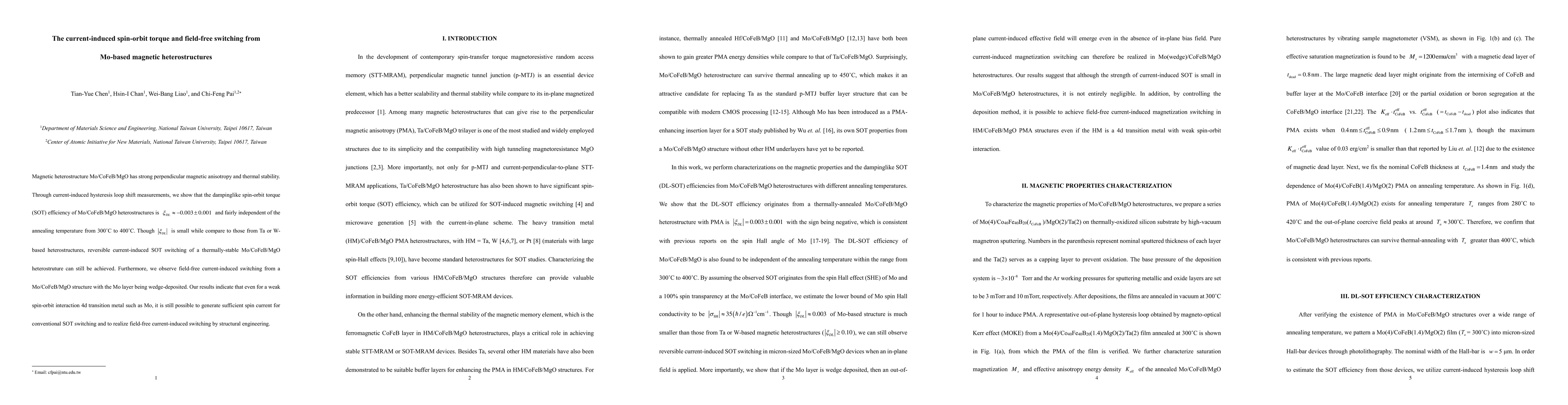 Summary: Research demonstrates current-induced spin-orbit torque switching in Mo/CoFeB/MgO magnetic heterostructures with strong anisotropy and stability. Despite a small damping-like spin-orbit torque efficiency, reversible switching and field-free switching are achieved, highlighting the potential of structural engineering to enable field-free switching even with weak spin-orbit interactions.