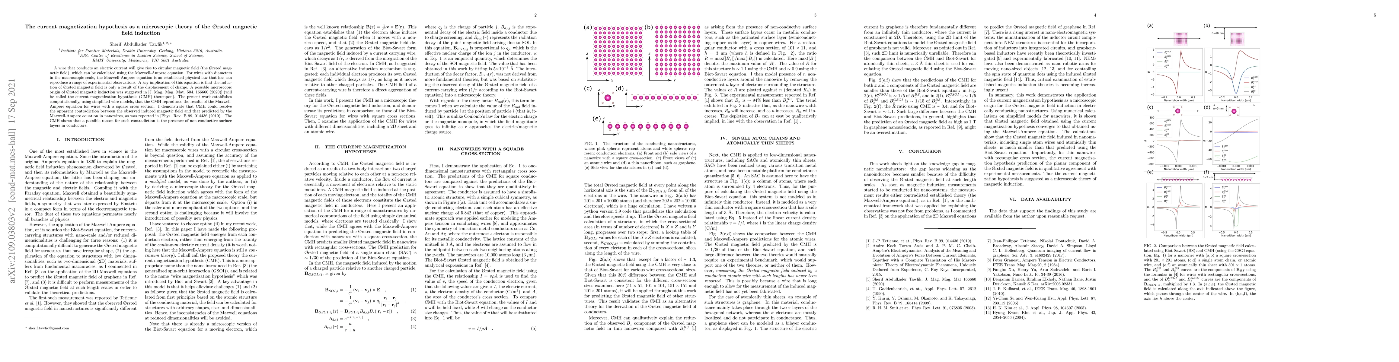 A wire that conducts an electric current will give rise to circular magnetic field (the \O{}rsted magnetic field), which can be calculated using the Maxwell-Ampere equation. For wires with diameters in the macroscopic scale, the Maxwell-Ampere equation is an established physical law that has can reproduce a range of experimental observations. A key implication of this equation is that the induction of \O{}rsted magnetic field is only a result of the displacement of charge. A possible microscopic origin of \O{}rsted magnetic induction was suggested in [J. Mag. Mag. Mat. 504, 166660 (2020)] (will be called the current magnetization hypothesis (CMH) thereupon). The present work establishes computationally, using simplified wire models, that the CMH reproduces the results of the Maxwell-Ampere equation for wires with a square cross section. I demonstrate that CMH could resolve the apparent contradiction between the observed induced magnetic field and that predicted by the Maxwell-Ampere equation in nanowires, as was reported in [Phys. Rev. B 99, 014436 (2019)]. The CMH shows that a possible reason for such contradiction is the presence of non-conductive surface layers in conductors.
