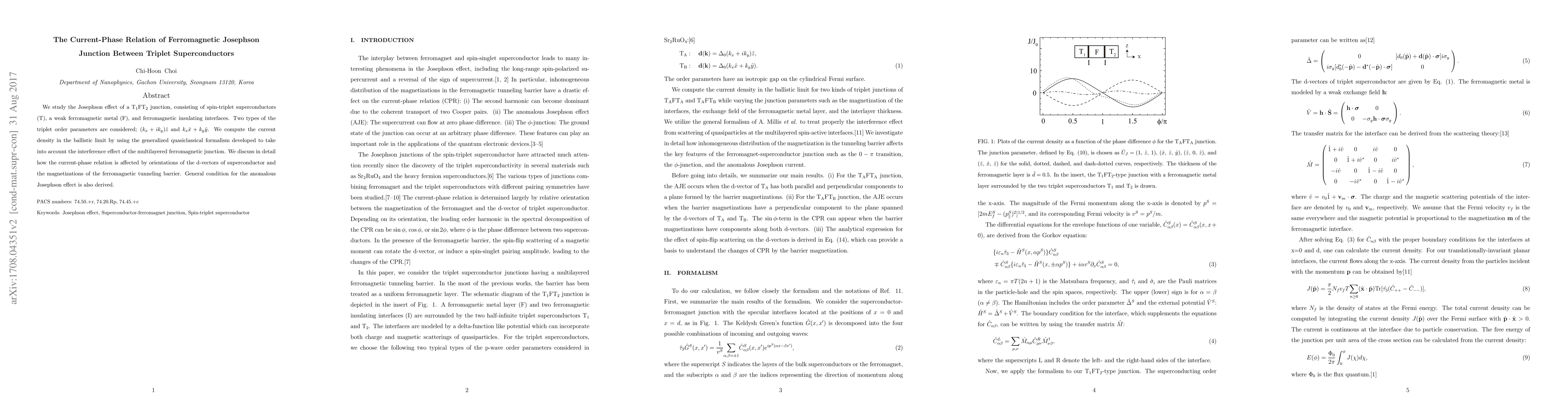 This paper investigates the Josephson effect in a $\rm{T_1 F T_2}$ junction with spin-triplet superconductors separated by a ferromagnetic metal and insulating interfaces. It computes the current density using a generalized quasiclassical formalism and examines how the current-phase relation varies with the orientations of superconductor d-vectors and magnetizations, deriving conditions for the anomalous Josephson effect.