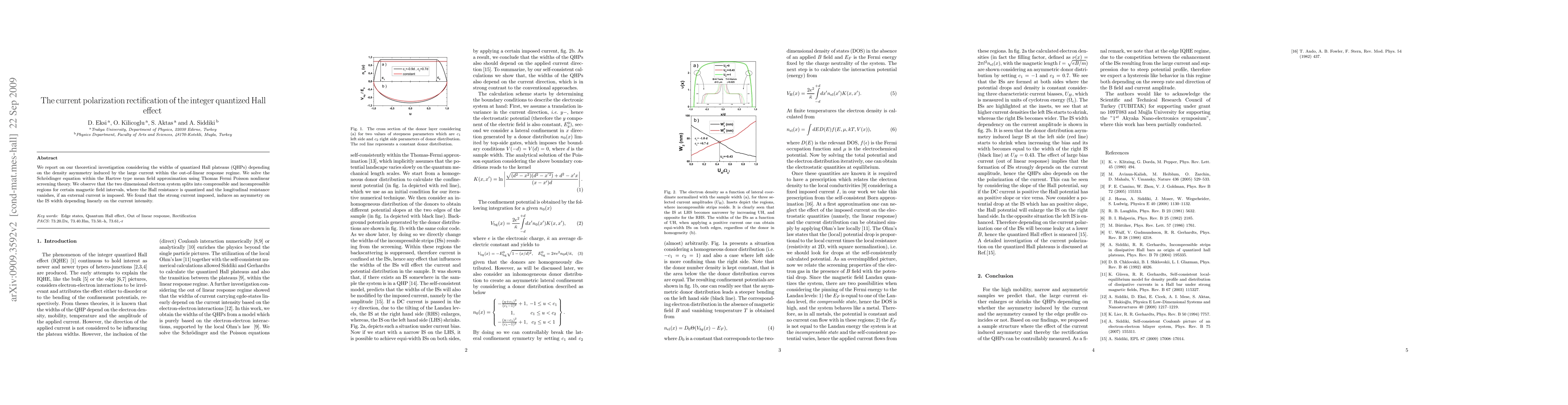 We report on our theoretical investigation considering the widths of quantized Hall plateaus (QHPs) depending on the density asymmetry induced by the large current within the out-of-linear response regime. We solve the Schrodinger equation within the Hartree type mean field approximation using Thomas Fermi Poisson nonlinear screening theory. We observe that the two dimensional electron system splits into compressible and incompressible regions for certain magnetic field intervals, where the Hall resistance is quantized and the longitudinal resistance vanishes, if an external current is imposed. We found that the strong current imposed, induces an asymmetry on the IS width depending linearly on the current intensity.