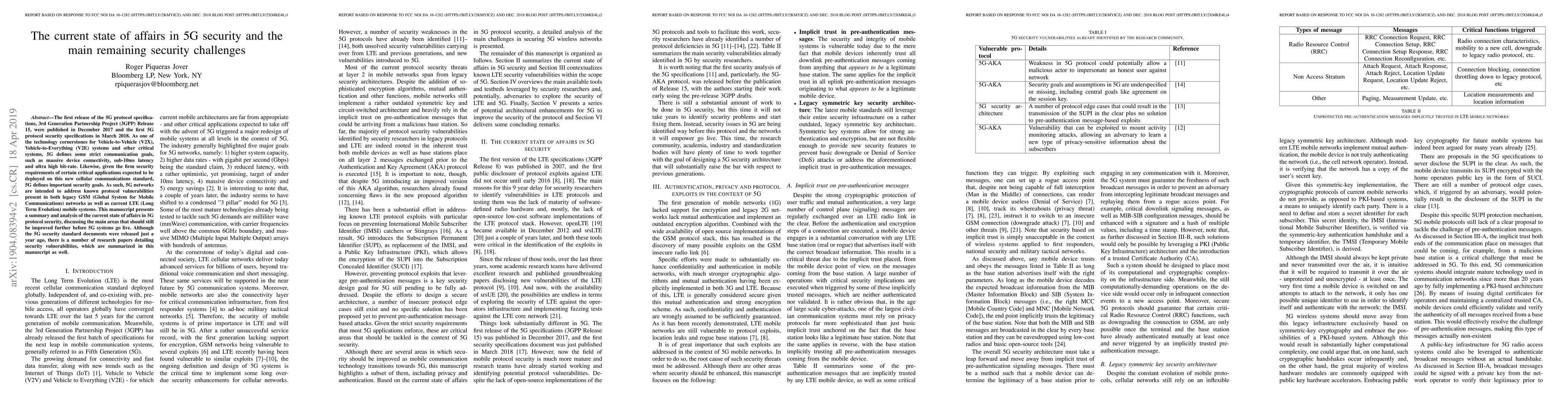 The first release of the 5G protocol specifications, 3rd Generation Partnership Project (3GPP) Release 15, were published in December 2017 and the first 5G protocol security specifications in March 2018. As one of the technology cornerstones for Vehicle-to-Vehicle (V2X), Vehicle-to-Everything (V2E) systems and other critical systems, 5G defines some strict communication goals, such as massive device connectivity, sub-10ms latency and ultra high bit-rate. Likewise, given the firm security requirements of certain critical applications expected to be deployed on this new cellular communications standard, 5G defines important security goals. As such, 5G networks are intended to address known protocol vulnerabilities present in both legacy GSM (Global System for Mobile Communications) networks as well as current LTE (Long Term Evolution) mobile systems. This manuscript presents a summary and analysis of the current state of affairs in 5G protocol security, discussing the main areas that should still be improved further before 5G systems go live. Although the 5G security standard documents were released just a year ago, there is a number of research papers detailing security vulnerabilities, which are summarized in this manuscript as well.