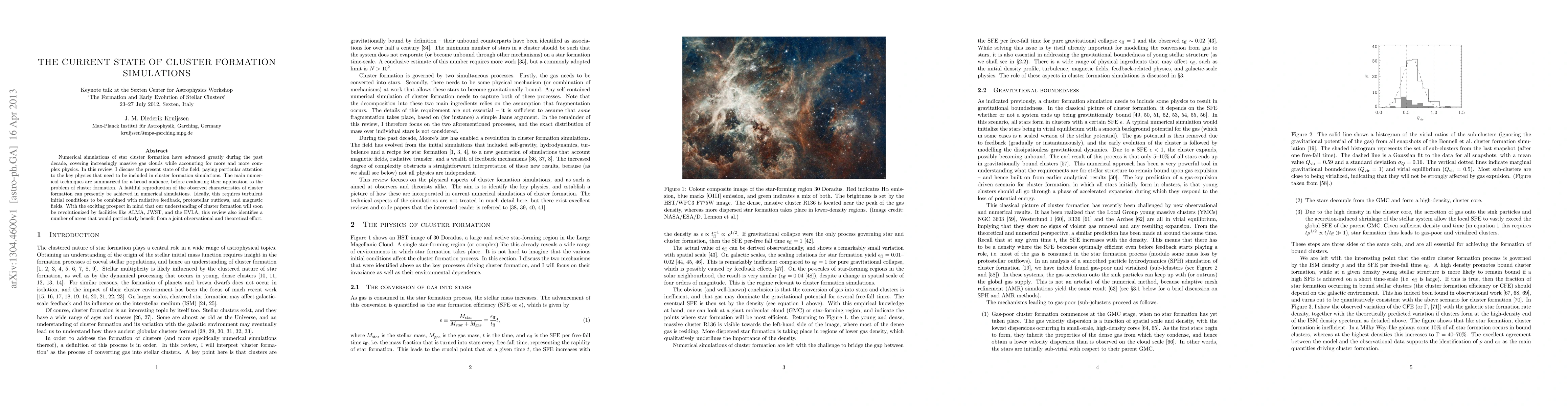 Numerical simulations of star cluster formation have advanced greatly during the past decade, covering increasingly massive gas clouds while accounting for more and more complex physics. In this review, I discuss the present state of the field, paying particular attention to the key physics that need to be included in cluster formation simulations. The main numerical techniques are summarized for a broad audience, before evaluating their application to the problem of cluster formation. A faithful reproduction of the observed characteristics of cluster formation can presently be achieved in numerical simulations. Ideally, this requires turbulent initial conditions to be combined with radiative feedback, protostellar outflows, and magnetic fields. With the exciting prospect in mind that our understanding of cluster formation will soon be revolutionized by facilities like ALMA, JWST, and the EVLA, this review also identifies a number of areas that would particularly benefit from a joint observational and theoretical effort.