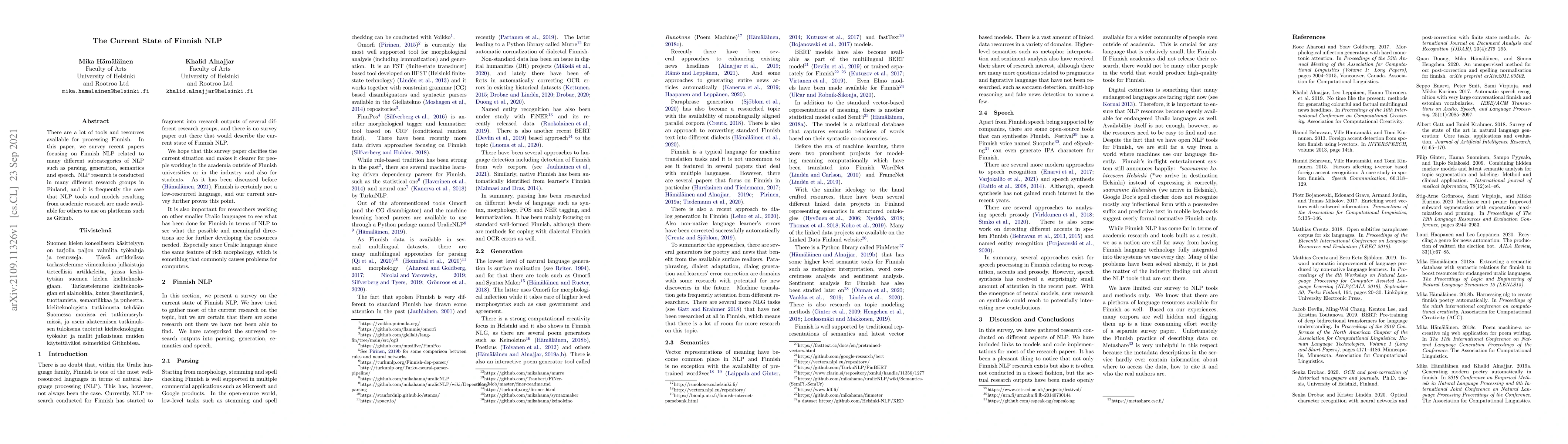 There are a lot of tools and resources available for processing Finnish. In this paper, we survey recent papers focusing on Finnish NLP related to many different subcategories of NLP such as parsing, generation, semantics and speech. NLP research is conducted in many different research groups in Finland, and it is frequently the case that NLP tools and models resulting from academic research are made available for others to use on platforms such as Github.