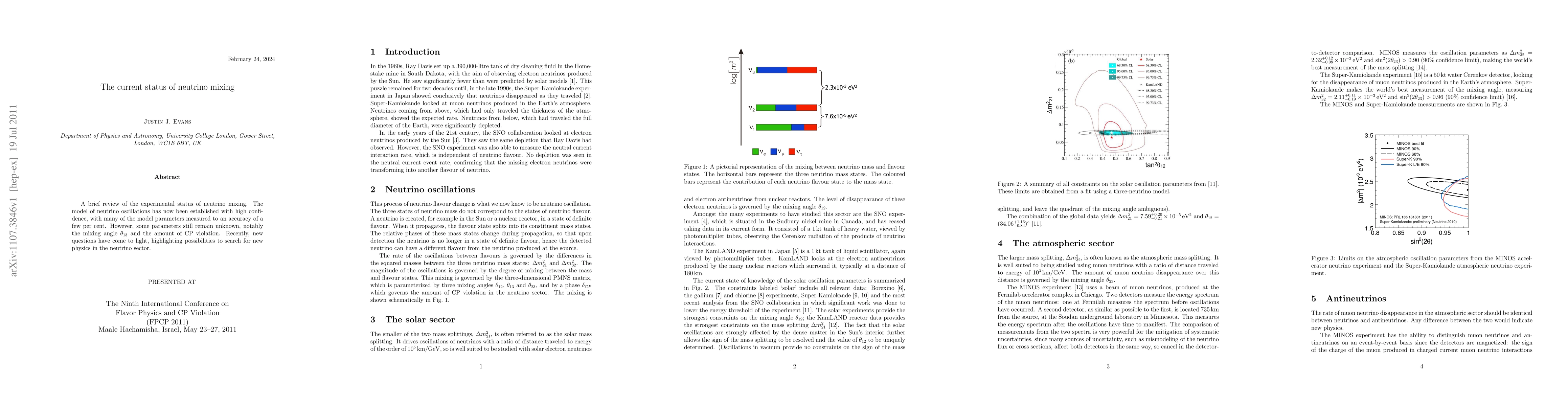 This paper reviews the experimental status of neutrino mixing, confirming the established model of neutrino oscillations with precise measurements of most parameters. However, uncertainties remain regarding the mixing angle $\theta_{13}$ and CP violation, prompting new inquiries into potential new physics in the neutrino sector.