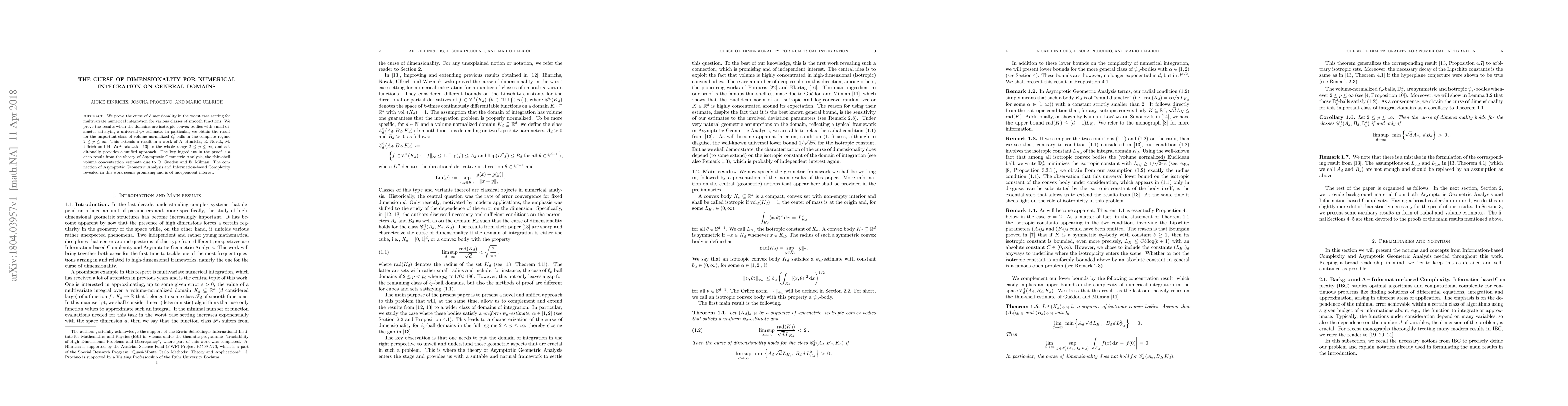 We prove the curse of dimensionality in the worst case setting for multivariate numerical integration for various classes of smooth functions. We prove the results when the domains are isotropic convex bodies with small diameter satisfying a universal $\psi_2$-estimate. In particular, we obtain the result for the important class of volume-normalized $\ell_p^d$-balls in the complete regime $2\leq p \leq \infty$. This extends a result in a work of A. Hinrichs, E. Novak, M. Ullrich and H. Wo\'zniakowski [J. Complexity, 30(2), 117-143, 2014] to the whole range $2\leq p \leq \infty$, and additionally provides a unified approach. The key ingredient in the proof is a deep result from the theory of Asymptotic Geometric Analysis, the thin-shell volume concentration estimate due to O. Gu\'edon and E. Milman. The connection of Asymptotic Geometric Analysis and Information-based Complexity revealed in this work seems promising and is of independent interest.