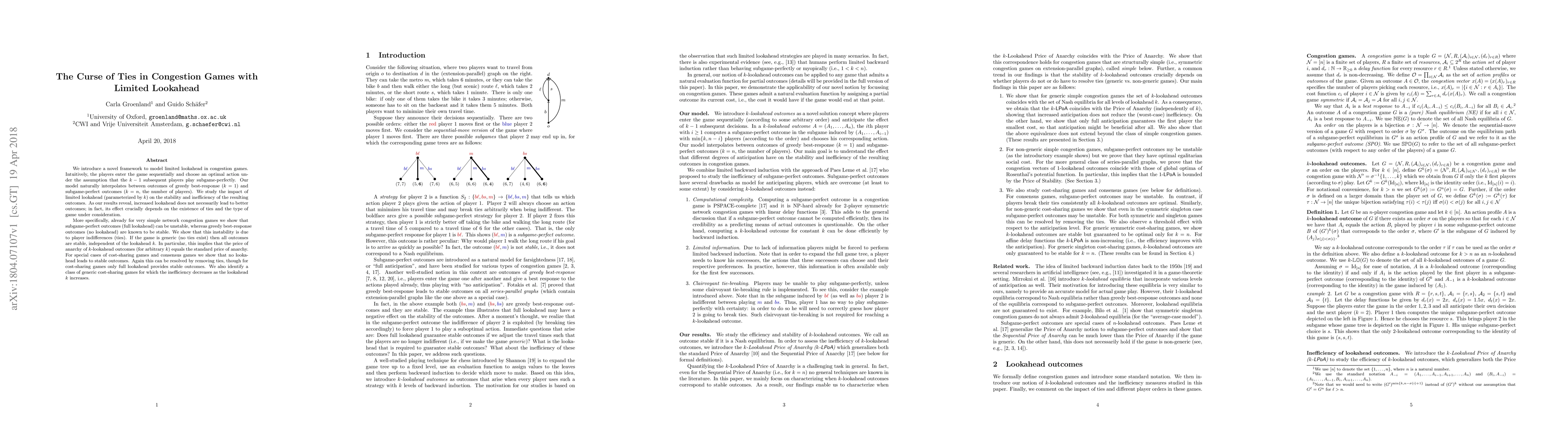 We introduce a novel framework to model limited lookahead in congestion games. Intuitively, the players enter the game sequentially and choose an optimal action under the assumption that the $k-1$ subsequent players play subgame-perfectly. Our model naturally interpolates between outcomes of greedy best-response ($k=1$) and subgame-perfect outcomes ($k=n$, the number of players). We study the impact of limited lookahead (parameterized by $k$) on the stability and inefficiency of the resulting outcomes. As our results reveal, increased lookahead does not necessarily lead to better outcomes; in fact, its effect crucially depends on the existence of ties and the type of game under consideration. More specifically, already for very simple network congestion games we show that subgame-perfect outcomes (full lookahead) can be unstable, whereas greedy best-response outcomes (no lookahead) are known to be stable. We show that this instability is due to player indifferences (ties). If the game is generic (no ties exist) then all outcomes are stable, independent of the lookahead $k$. In particular, this implies that the price of anarchy of $k$-lookahead outcomes (for arbitrary $k$) equals the standard price of anarchy. For special cases of cost-sharing games and consensus games we show that no lookahead leads to stable outcomes. Again this can be resolved by removing ties, though for cost-sharing games only full lookahead provides stable outcomes. We also identify a class of generic cost-sharing games for which the inefficiency decreases as the lookahead $k$ increases.