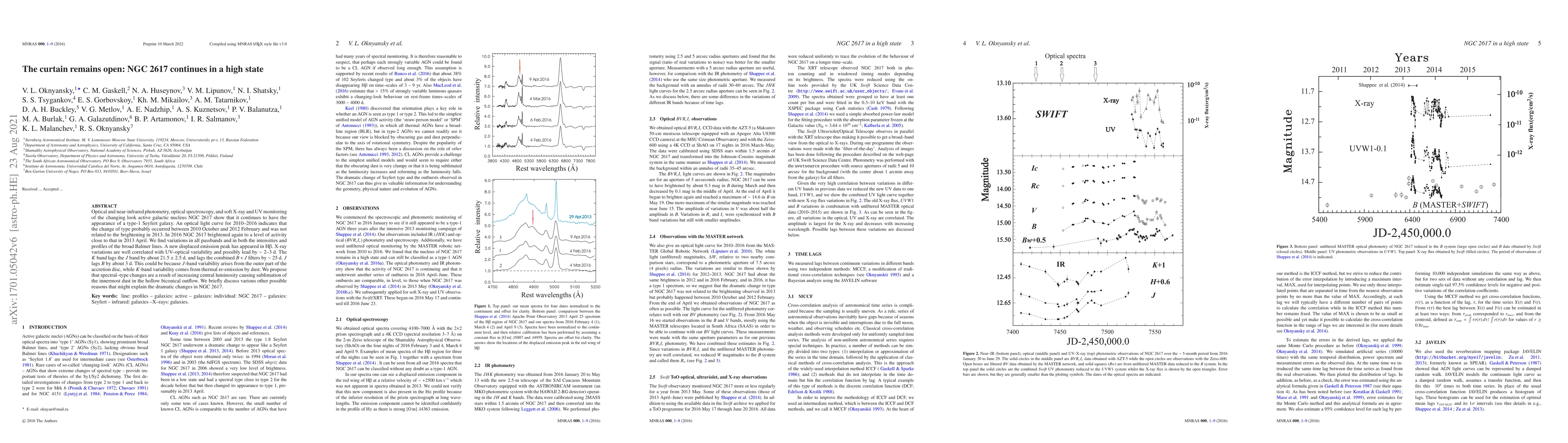 Optical and near-infrared photometry, optical spectroscopy, and soft X-ray and UV monitoring of the changing look active galactic nucleus NGC 2617 show that it continues to have the appearance of a type-1 Seyfert galaxy. An optical light curve for 2010-2016 indicates that the change of type probably occurred between 2010 October and 2012 February and was not related to the brightening in 2013. In 2016 NGC 2617 brightened again to a level of activity close to that in 2013 April. We find variations in all passbands and in both the intensities and profiles of the broad Balmer lines. A new displaced emission peak has appeared in H$\beta$. X-ray variations are well correlated with UV-optical variability and possibly lead by $\sim$ 2-3 d. The $K$ band lags the $J$ band by about 21.5 $\pm$ 2.5 d. and lags the combined $B+J$ filters by $\sim$ 25 d. $J$ lags $B$ by about 3 d. This could be because $J$-band variability arises from the outer part of the accretion disc, while $K$-band variability comes from thermal re-emission by dust. We propose that spectral-type changes are a result of increasing central luminosity causing sublimation of the innermost dust in the hollow biconical outflow. We briefly discuss various other possible reasons that might explain the dramatic changes in NGC 2617.