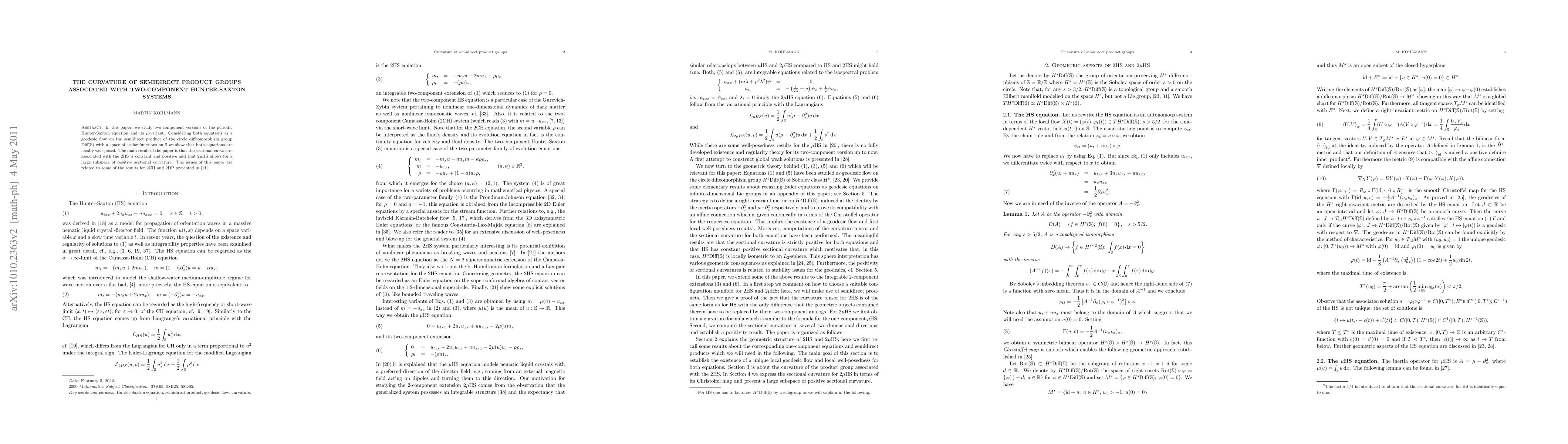 The paper investigates the curvature of semidirect product groups associated with two-component Hunter-Saxton systems, showing that both equations have positive sectional curvature and a large subspace of positive curvature.
