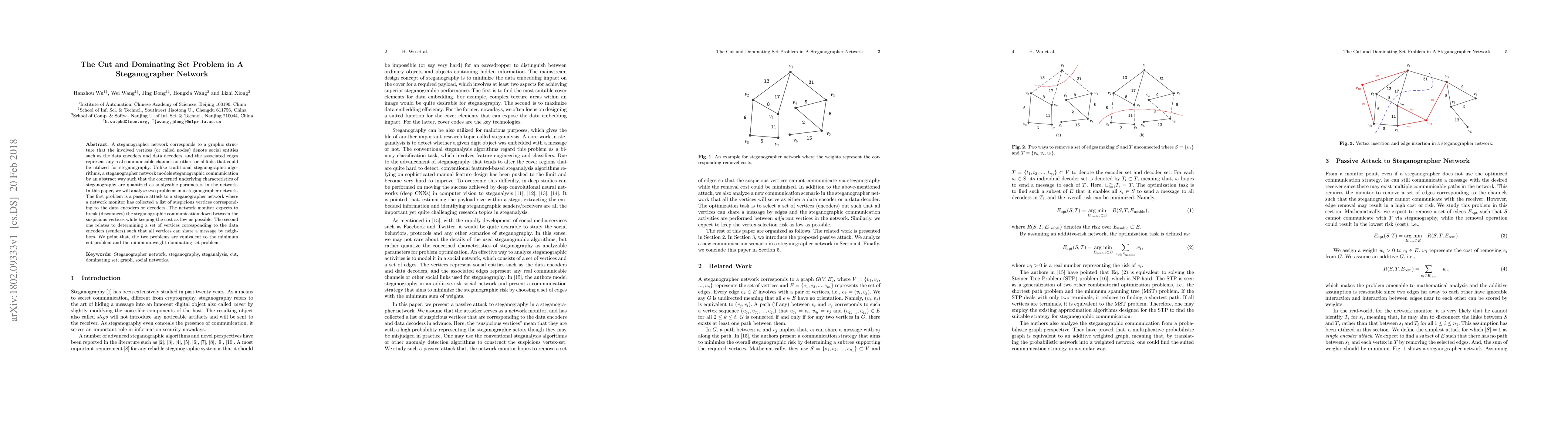 A steganographer network corresponds to a graphic structure that the involved vertices (or called nodes) denote social entities such as the data encoders and data decoders, and the associated edges represent any real communicable channels or other social links that could be utilized for steganography. Unlike traditional steganographic algorithms, a steganographer network models steganographic communication by an abstract way such that the concerned underlying characteristics of steganography are quantized as analyzable parameters in the network. In this paper, we will analyze two problems in a steganographer network. The first problem is a passive attack to a steganographer network where a network monitor has collected a list of suspicious vertices corresponding to the data encoders or decoders. The network monitor expects to break (disconnect) the steganographic communication down between the suspicious vertices while keeping the cost as low as possible. The second one relates to determining a set of vertices corresponding to the data encoders (senders) such that all vertices can share a message by neighbors. We point that, the two problems are equivalent to the minimum cut problem and the minimum-weight dominating set problem.