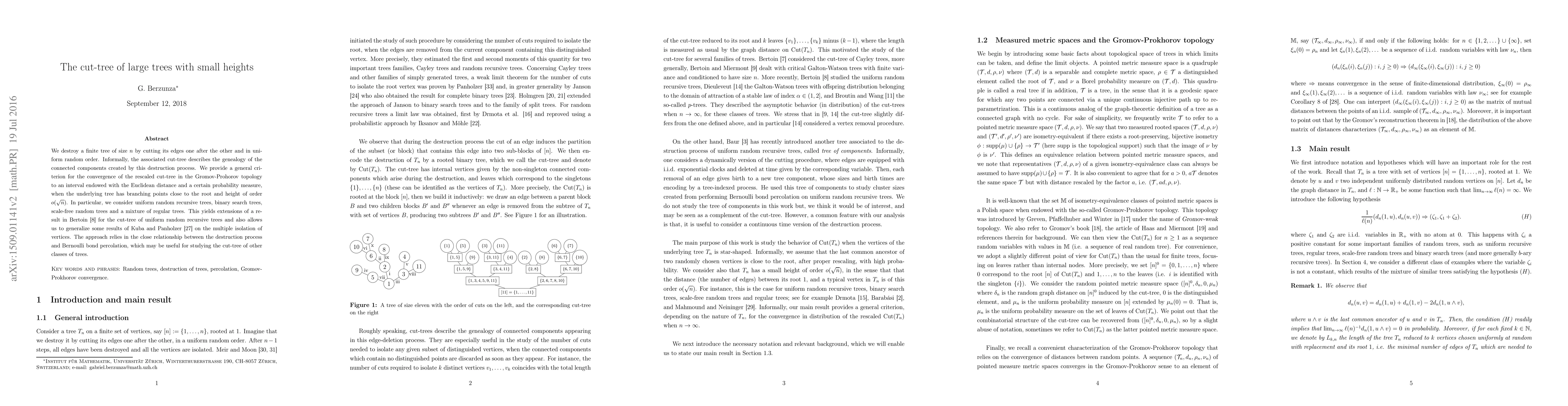 This research provides a criterion for the convergence of rescaled cut-trees of finite trees with small heights to an interval with Euclidean distance, when the trees are destroyed in random edge-cutting order. The method uses the connection between the destruction process and Bernoulli bond percolation, applicable to various tree types including recursive, search, scale-free, and regular trees. It extends previous results on cut-trees of uniform random recursive trees and generalizes findings on vertex isolation in trees.