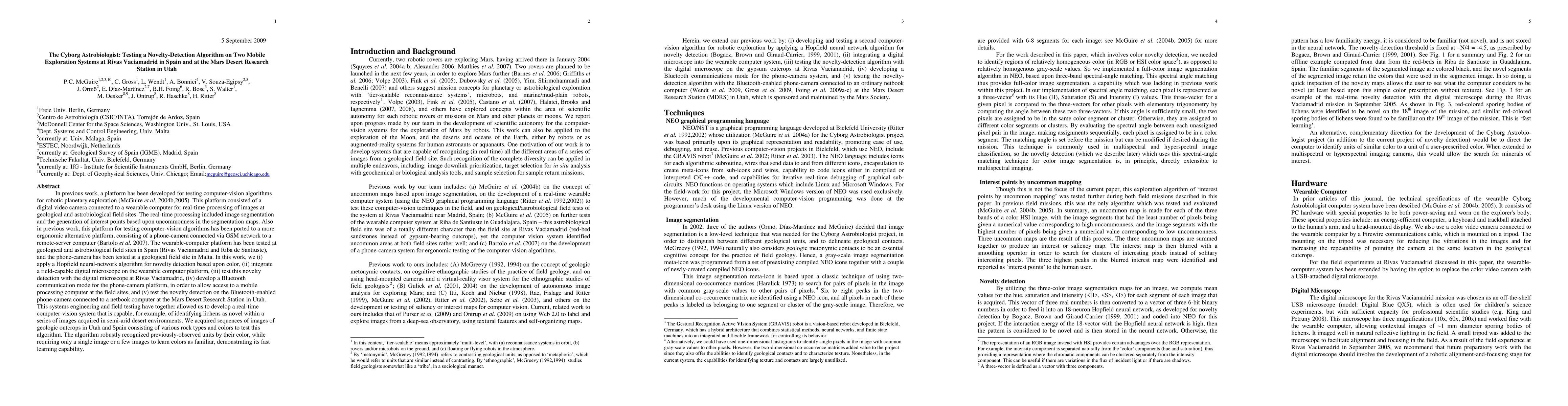 (ABRIDGED) In previous work, two platforms have been developed for testing computer-vision algorithms for robotic planetary exploration (McGuire et al. 2004b,2005; Bartolo et al. 2007). The wearable-computer platform has been tested at geological and astrobiological field sites in Spain (Rivas Vaciamadrid and Riba de Santiuste), and the phone-camera has been tested at a geological field site in Malta. In this work, we (i) apply a Hopfield neural-network algorithm for novelty detection based upon color, (ii) integrate a field-capable digital microscope on the wearable computer platform, (iii) test this novelty detection with the digital microscope at Rivas Vaciamadrid, (iv) develop a Bluetooth communication mode for the phone-camera platform, in order to allow access to a mobile processing computer at the field sites, and (v) test the novelty detection on the Bluetooth-enabled phone-camera connected to a netbook computer at the Mars Desert Research Station in Utah. This systems engineering and field testing have together allowed us to develop a real-time computer-vision system that is capable, for example, of identifying lichens as novel within a series of images acquired in semi-arid desert environments. We acquired sequences of images of geologic outcrops in Utah and Spain consisting of various rock types and colors to test this algorithm. The algorithm robustly recognized previously-observed units by their color, while requiring only a single image or a few images to learn colors as familiar, demonstrating its fast learning capability.