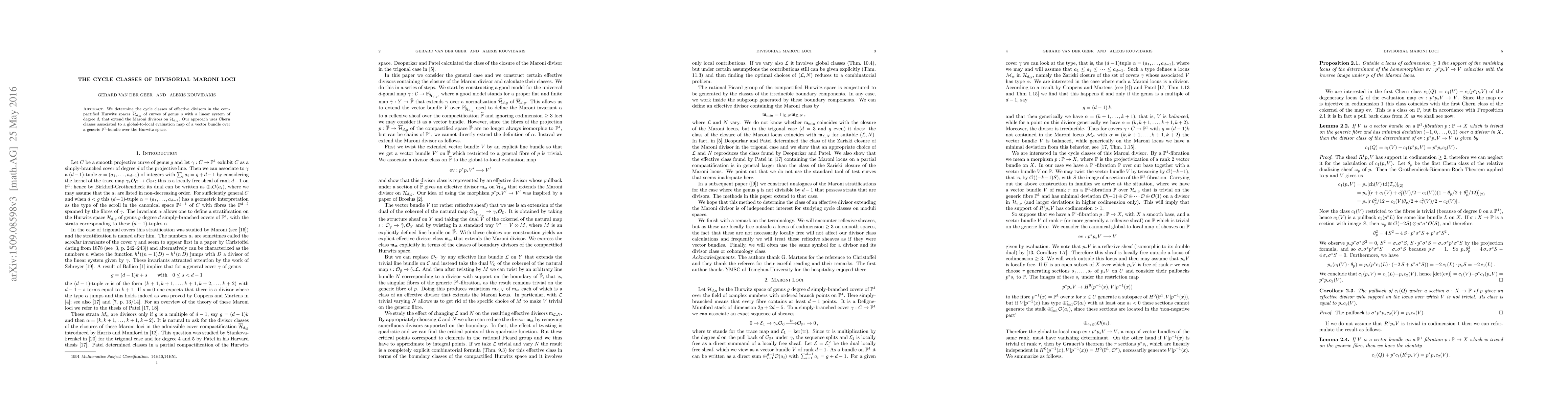 Summary: This paper determines the cycle classes of effective divisors in compactified Hurwitz spaces for curves of genus g and degree d, extending Maroni divisors, using Chern classes linked to a vector bundle over a $P^1$-bundle. The method employs a global-to-local evaluation map.