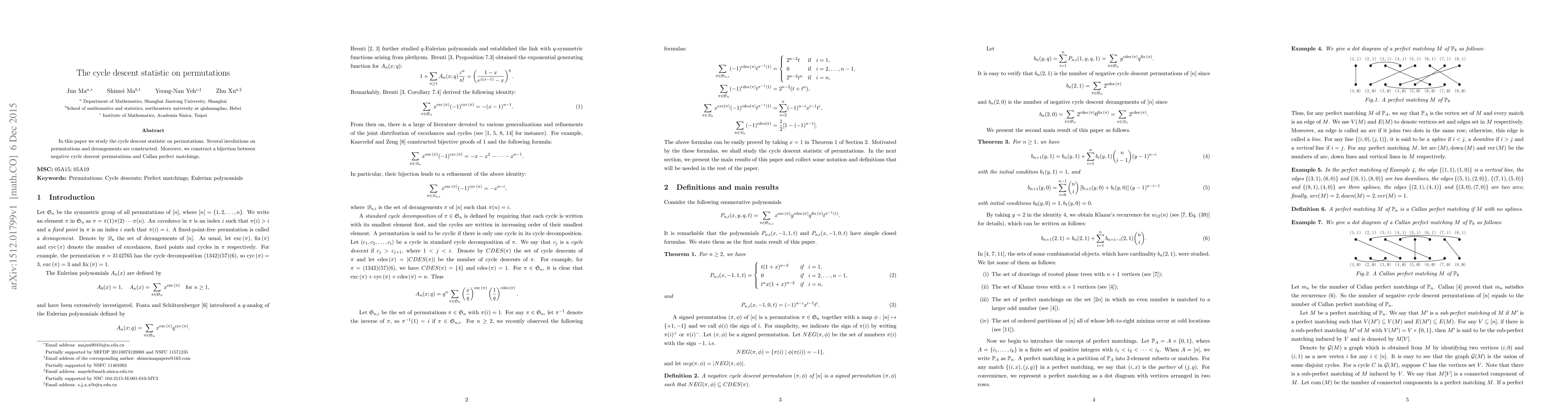 The paper explores the cycle descent statistic in permutations, constructing involutions and derangements while establishing a bijection between negative cycle descent permutations and Callan perfect matchings.