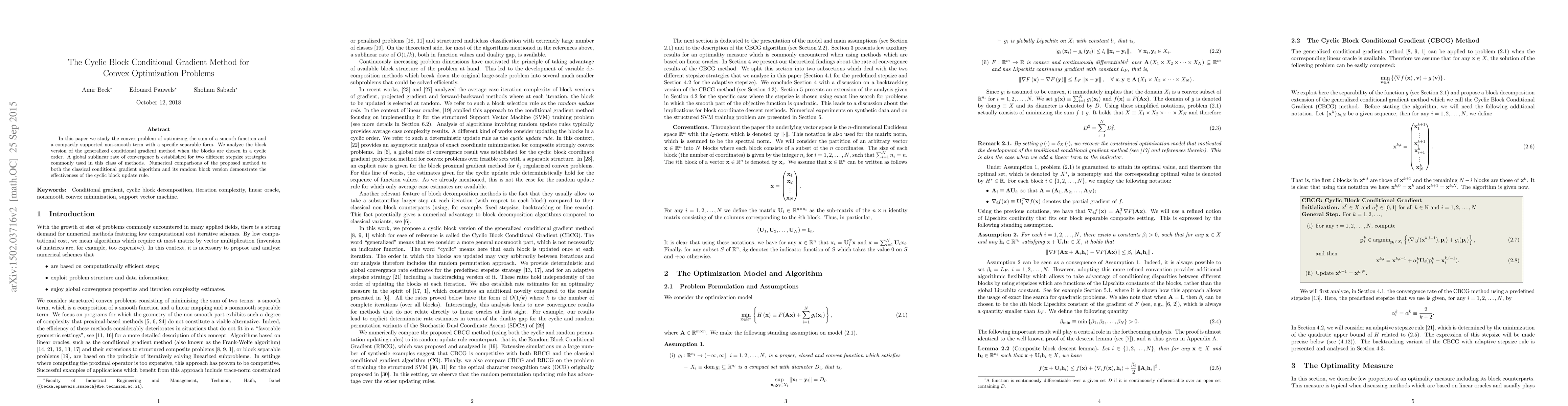 This paper introduces the cyclic block conditional gradient method for optimizing convex problems involving smooth and compactly supported non-smooth terms. It establishes a global sublinear convergence rate and shows the method's effectiveness through numerical comparisons with classical and random block versions.