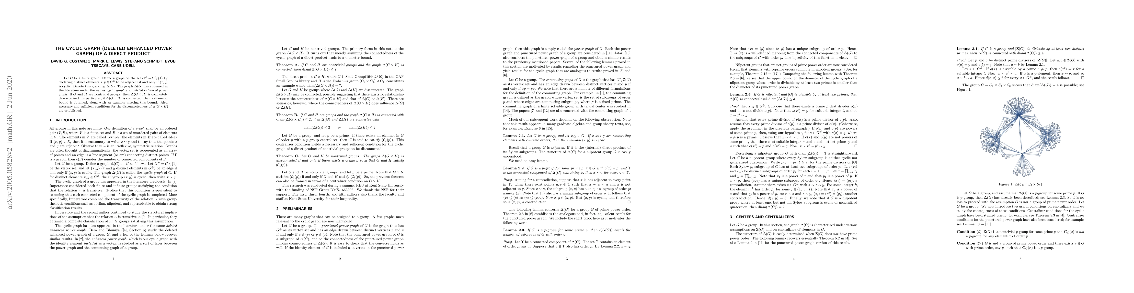 Let $G$ be a finite group. Define a graph on the set $G^{\#} = G \setminus \{ 1 \}$ by declaring distinct elements $x,y\in G^{\#}$ to be adjacent if and only if $\langle x,y\rangle$ is cyclic. Denote this graph by $\Delta(G)$. The graph $\Delta(G)$ has appeared in the literature under the names cyclic graph and deleted enhanced power graph. If $G$ and $H$ are nontrivial groups, then $\Delta(G\times H)$ is completely characterized. In particular, if $\Delta(G\times H)$ is connected, then a diameter bound is obtained, along with an example meeting this bound. Also, necessary and sufficient conditions for the disconnectedness of $\Delta(G\times H)$ are established.