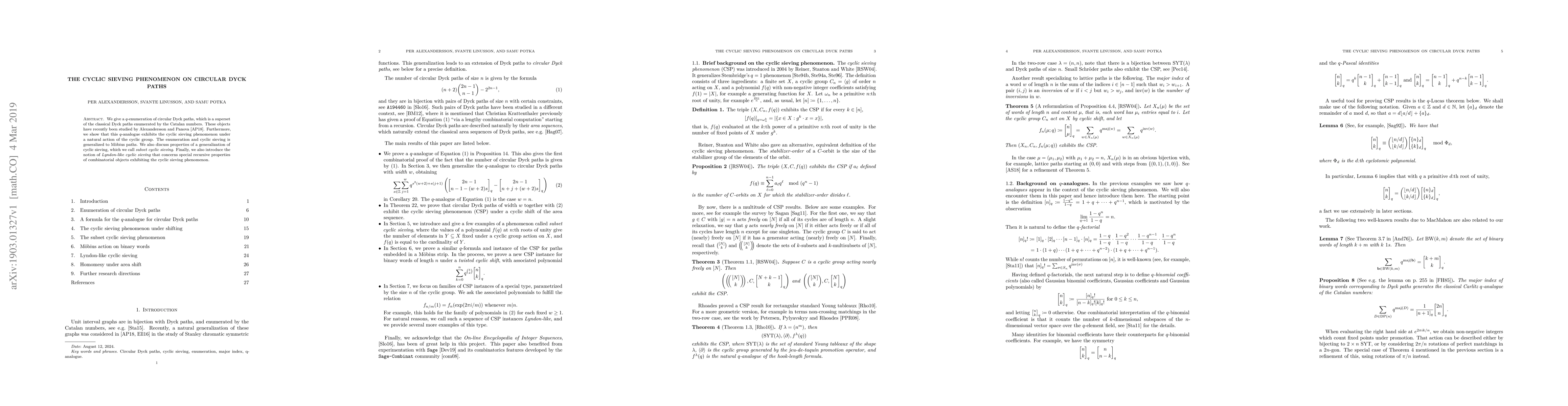 This paper enumerates circular Dyck paths using a $q$-analog and demonstrates their cyclic sieving phenomenon under a cyclic group action. It extends these findings to M\"obius paths and introduces subset and Lyndon-like cyclic sieving concepts.