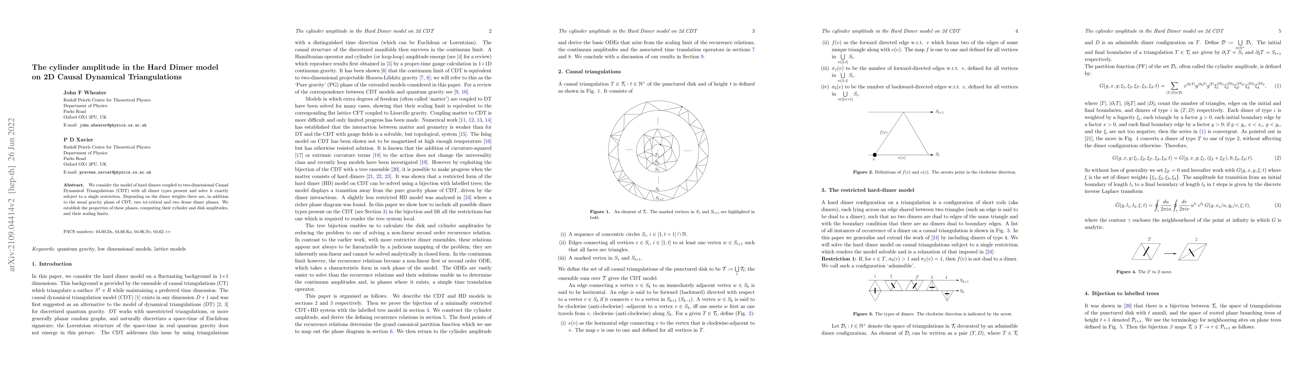 This paper exactly solves the hard dimer model coupled to 2D Causal Dynamical Triangulations, identifying four distinct phases including tri-critical and dense dimer phases. The study computes cylinder and disk amplitudes and explores their scaling limits.
