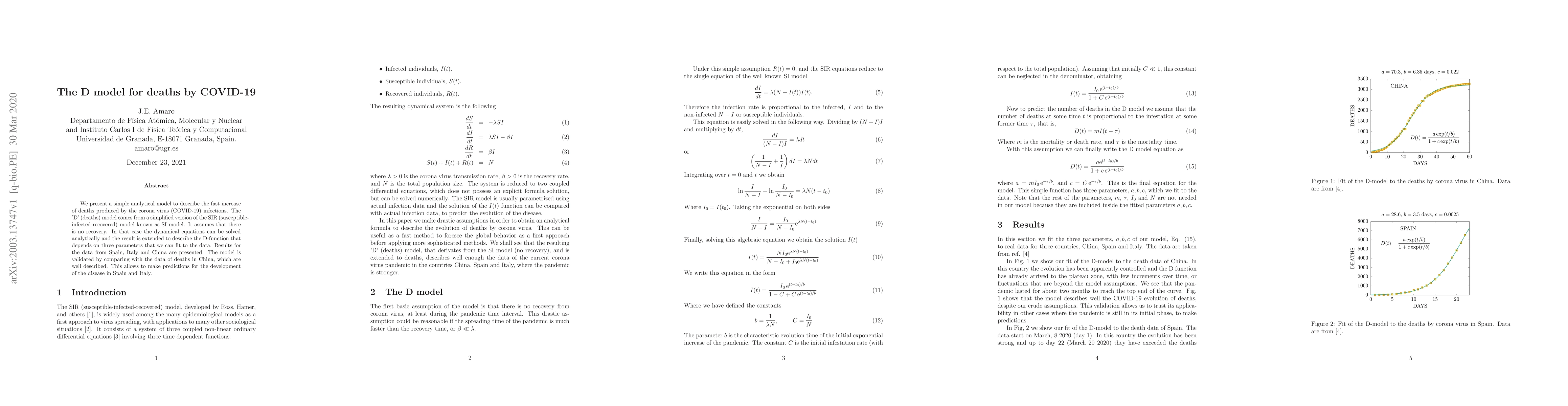 We present a simple analytical model to describe the fast increase of deaths produced by the corona virus (COVID-19) infections. The 'D' (deaths) model comes from a simplified version of the SIR (susceptible-infected-recovered) model known as SI model. It assumes that there is no recovery. In that case the dynamical equations can be solved analytically and the result is extended to describe the D-function that depends on three parameters that we can fit to the data. Results for the data from Spain, Italy and China are presented. The model is validated by comparing with the data of deaths in China, which are well described. This allows to make predictions for the development of the disease in Spain and Italy.