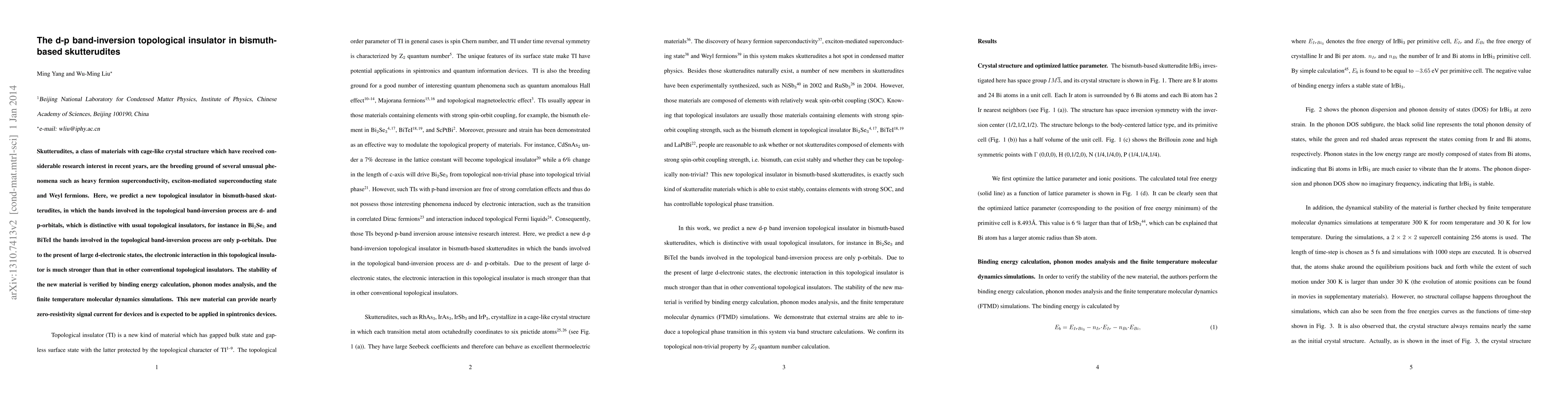 This paper predicts a novel d-p band-inversion topological insulator in bismuth-based skutterudites, featuring stronger electronic interactions due to d-orbital involvement, unlike conventional p-orbital-only topological insulators. Stability and potential for spintronics applications are confirmed through various simulations.