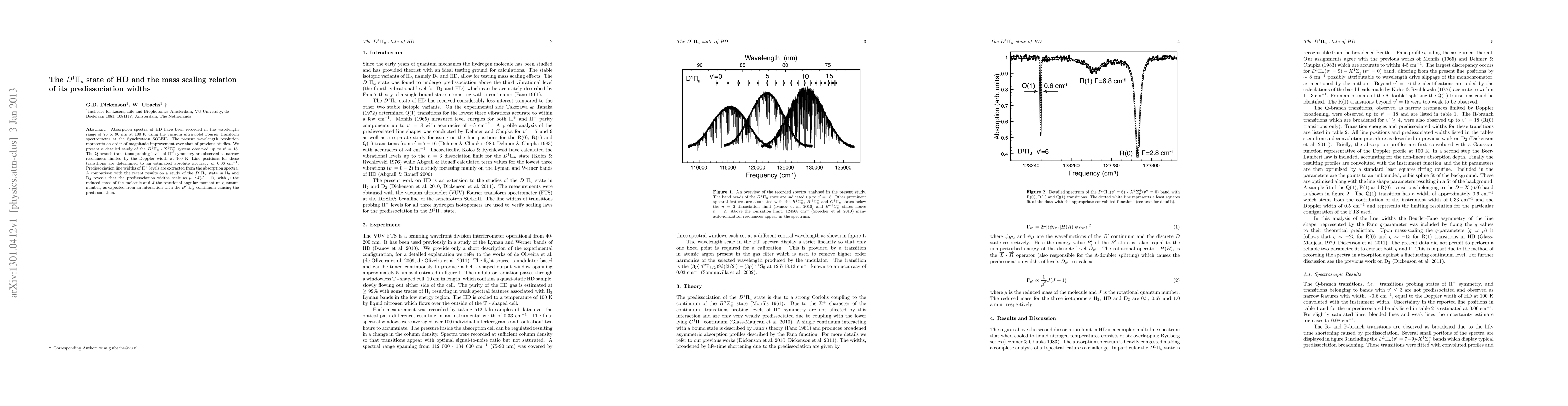 Absorption spectra of HD have been recorded in the wavelength range of 75 to 90 nm at 100 K using the vacuum ultraviolet Fourier transform spectrometer at the Synchrotron SOLEIL. The present wavelength resolution represents an order of magnitude improvement over that of previous studies. We present a detailed study of the D^1\Pi - X^1\Sigma^+_g system observed up to v'=18. The Q-branch transitions probing levels of \Pi^- symmetry are observed as narrow resonances limited by the Doppler width at 100 K. Line positions for these transitions are determined to an estimated absolute accuracy of 0.06 cm^{-1} . Predissociation line widths of \Pi^+ levels are extracted from the absorption spectra. A comparison with the recent results on a study of the D^1\Pi state in H_2 and D_2 reveals that the predissociation widths scale as \mu^-2J(J+1), with \mu the reduced mass of the molecule and J the rotational angular momentum quantum number, as expected from an interaction with the B'^1\Sigma_u^+ continuum causing the predissociation.