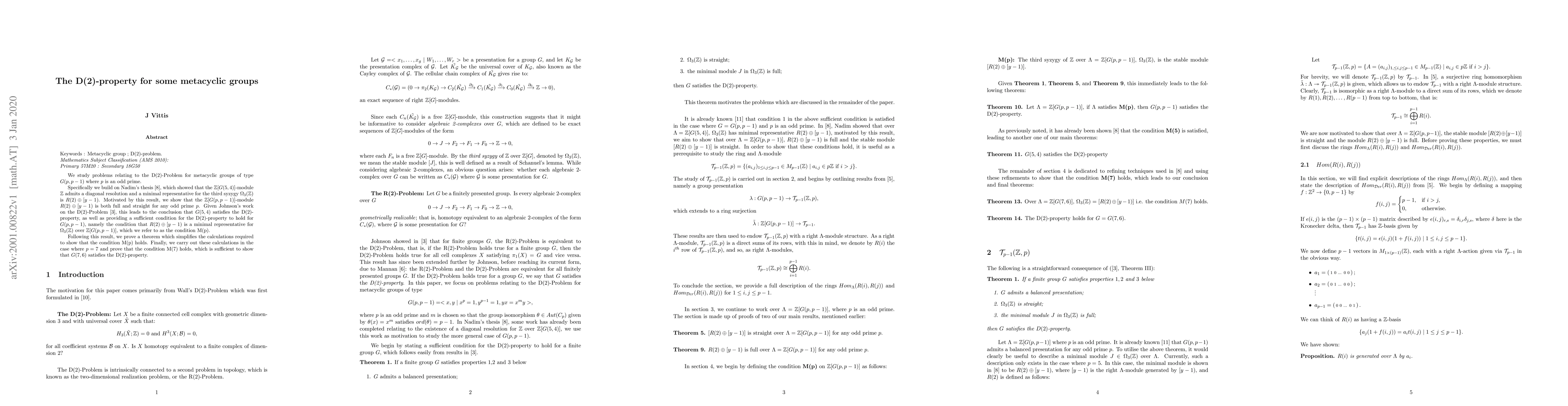 We study problems relating to the D(2)-Problem for metacyclic groups of type $G(p,p-1)$ where $p$ is an odd prime. Specifically we build on Nadim's thesis \cite{Jamil}, which showed that the $\mathbb{Z}[G(5,4)]$-module $\mathbb{Z}$ admits a diagonal resolution and a minimal representative for the third syzygy $\Omega_3(\mathbb{Z})$ is $R(2)\oplus[y-1)$. Motivated by this result, we show that the $\mathbb{Z}[G(p,p-1)]$-module $R(2)\oplus[y-1)$ is both full and straight for any odd prime $p$. Given Johnson's work on the D(2)-Problem \cite{D2}, this leads to the conclusion that $G(5,4)$ satisfies the D(2)-property, as well as providing a sufficient condition for the D(2)-property to hold for $G(p,p-1)$, namely the condition that $R(2)\oplus[y-1)$ is a minimal representative for $\Omega_3(\mathbb{Z})$ over $\mathbb{Z}[G(p,p-1)]$, which we refer to as the condition M(p). Following this result, we prove a theorem which simplifies the calculations required to show that the condition M(p) holds. Finally, we carry out these calculations in the case where $p=7$ and prove that the condition M(7) holds, which is sufficient to show that $G(7,6)$ satisfies the D(2)-property.