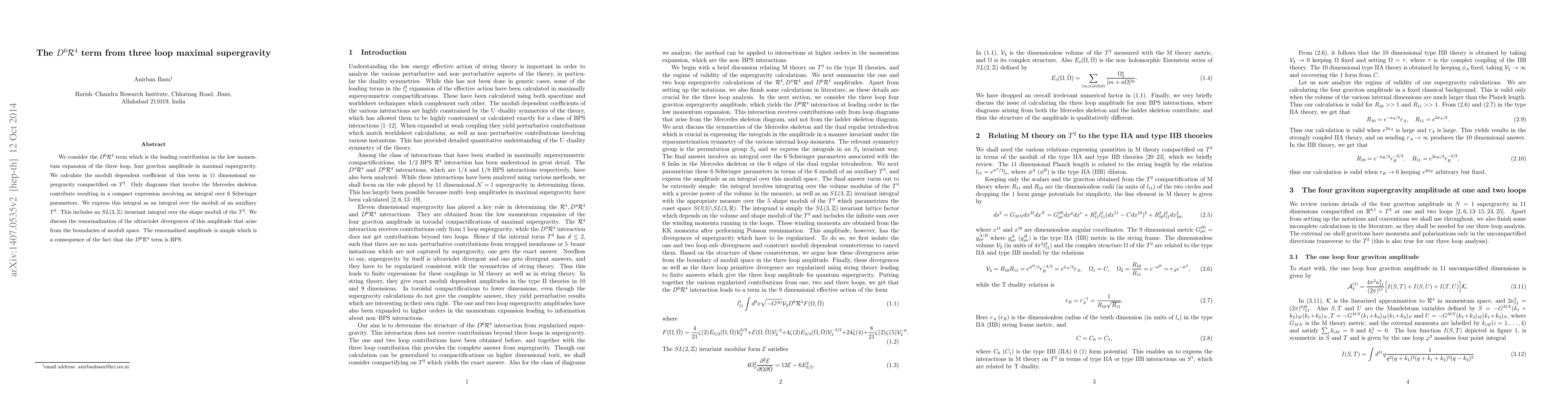 We consider the D^6 R^4 term which is the leading contribution in the low momentum expansion of the three loop, four graviton amplitude in maximal supergravity. We calculate the moduli dependent coefficient of this term in 11 dimensional supergravity compactified on T^2. Only diagrams that involve the Mercedes skeleton contribute resulting in a compact expression involving an integral over 6 Schwinger parameters. We express this integral as an integral over the moduli of an auxiliary T^3. This includes an SL(3,Z) invariant integral over the shape moduli of the T^3. We discuss the renormalization of the ultraviolet divergences of this amplitude that arise from the boundaries of moduli space. The renormalized amplitude is simple which is a consequence of the fact that the D^6 R^4 term is BPS.