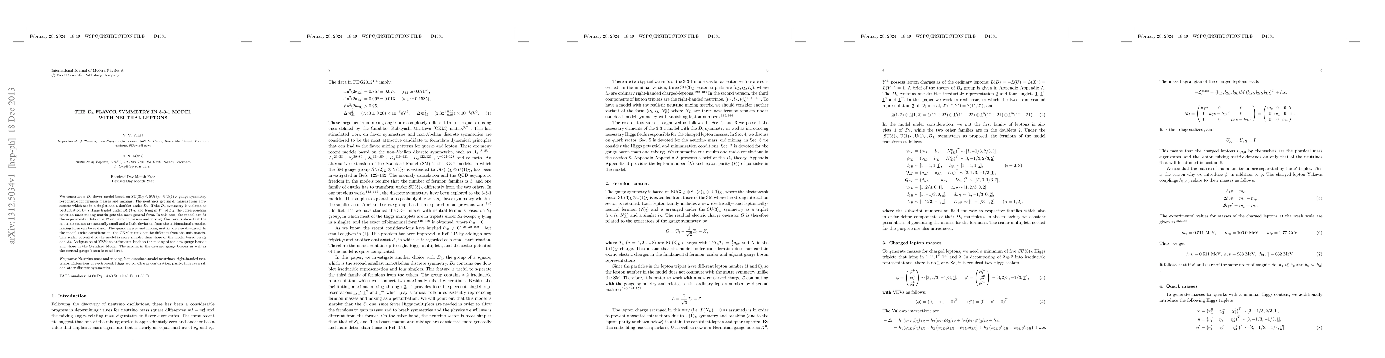 We construct a $D_4$ flavor model based on SU(3)_C X SU}(3_L X U(1)_X gauge symmetry responsible for fermion masses and mixings. The neutrinos get small masses from antisextets which are in a singlet and a doublet under $D_4$. If the D_4 symmetry is violated as perturbation by a Higgs triplet under SU(3)_L and lying in {1}''' of D_4, the corresponding neutrino mass mixing matrix gets the most general form. In this case, the model can fit the experimental data in 2012 on neutrino masses and mixing. Our results show that the neutrino masses are naturally small and a little deviation from the tribimaximal neutrino mixing form can be realized. The quark masses and mixing matrix are also discussed. In the model under consideration, the CKM matrix can be different from the unit matrix. The scalar potential of the model is more simpler than those of the model based on $S_3$ and $S_4$. Assignation of VEVs to antisextets leads to the mixing of the new gauge bosons and those in the Standard Model. The mixing in the charged gauge bosons as well as the neutral gauge boson is considered.