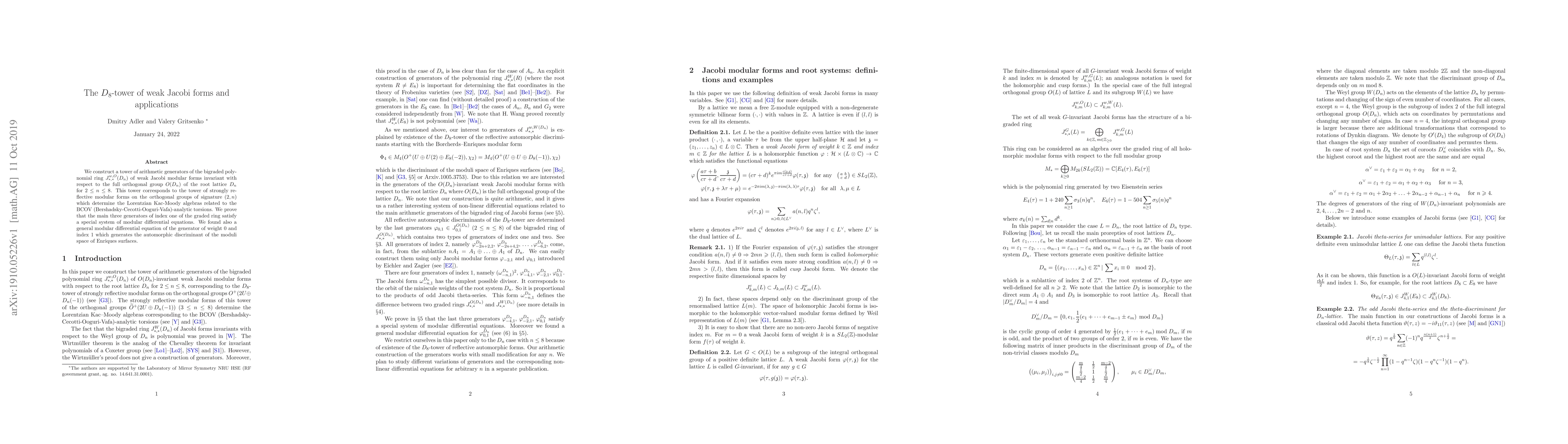 We construct a tower of arithmetic generators of the bigraded polynomial ring J_{*,*}^{w, O}(D_n) of weak Jacobi modular forms invariant with respect to the full orthogonal group O(D_n) of the root lattice D_n for 2\le n\le 8. This tower corresponds to the tower of strongly reflective modular forms on the orthogonal groups of signature (2,n) which determine the Lorentzian Kac-Moody algebras related to the BCOV (Bershadsky-Cecotti-Ooguri-Vafa)-analytic torsions. We prove that the main three generators of index one of the graded ring satisfy a special system of modular differential equations. We found also a general modular differential equation of the generator of weight 0 and index 1 which generates the automorphic discriminant of the moduli space of Enriques surfaces.