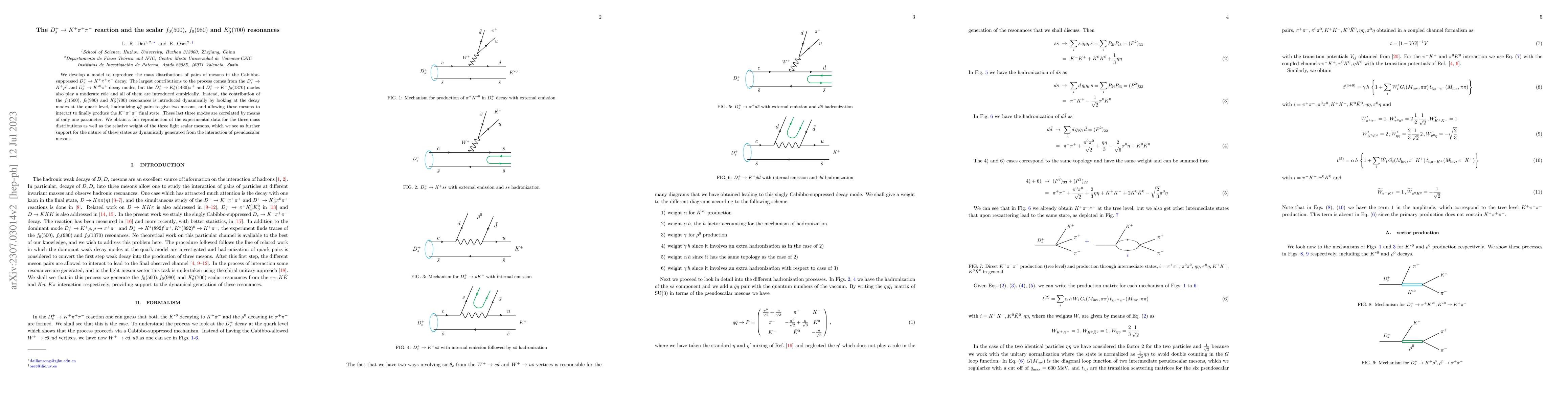 This research develops a model to analyze the $D^+_s \to K^+ \pi^+ \pi^-$ decay, attributing major contributions to $D^+_s \to K^+ \rho^0$ and $D^+_s \to K^{*0} \pi^+$ decay modes while dynamically incorporating the $f_0(500)$, $f_0(980)$, and $K^*_0(700)$ resonances. The model effectively reproduces experimental data, supporting the view of these scalar mesons as dynamically generated from meson interactions.