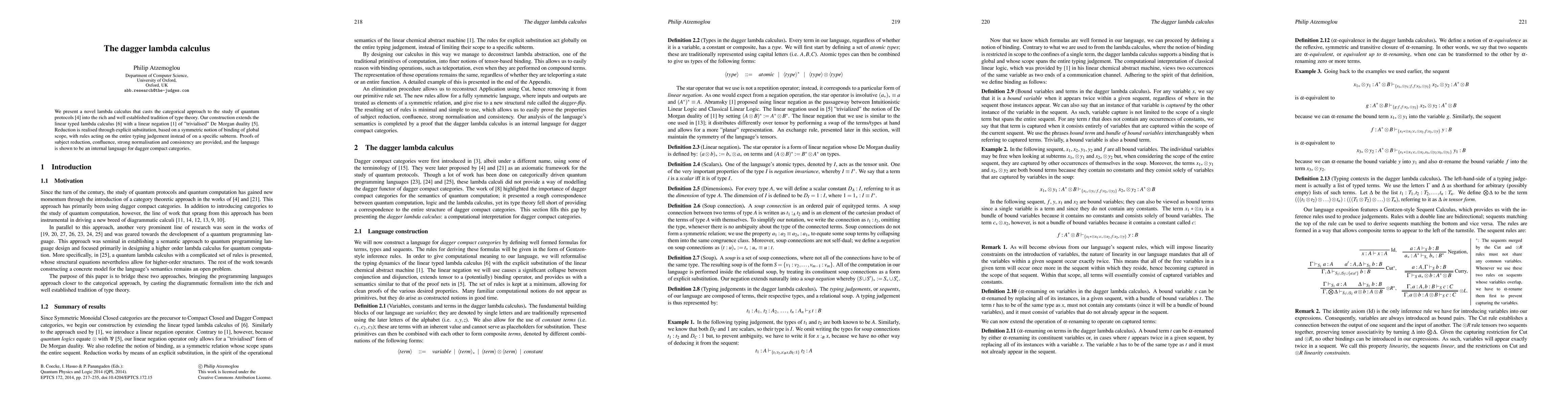 This paper introduces the dagger lambda calculus, extending linear type theory with linear negation to study quantum protocols. It provides proofs for key properties and shows the language corresponds to dagger compact categories.