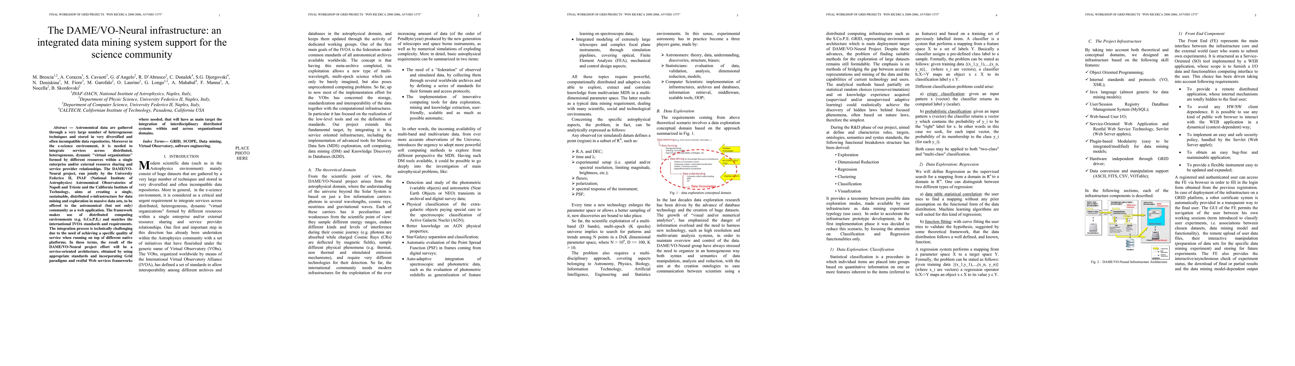 The DAME/VO-Neural project aims to create a unified, distributed e-infrastructure for data mining in astronomical datasets, leveraging distributed computing and adhering to international standards. The resulting service-oriented architecture will integrate diverse data sources and systems across organizational boundaries.