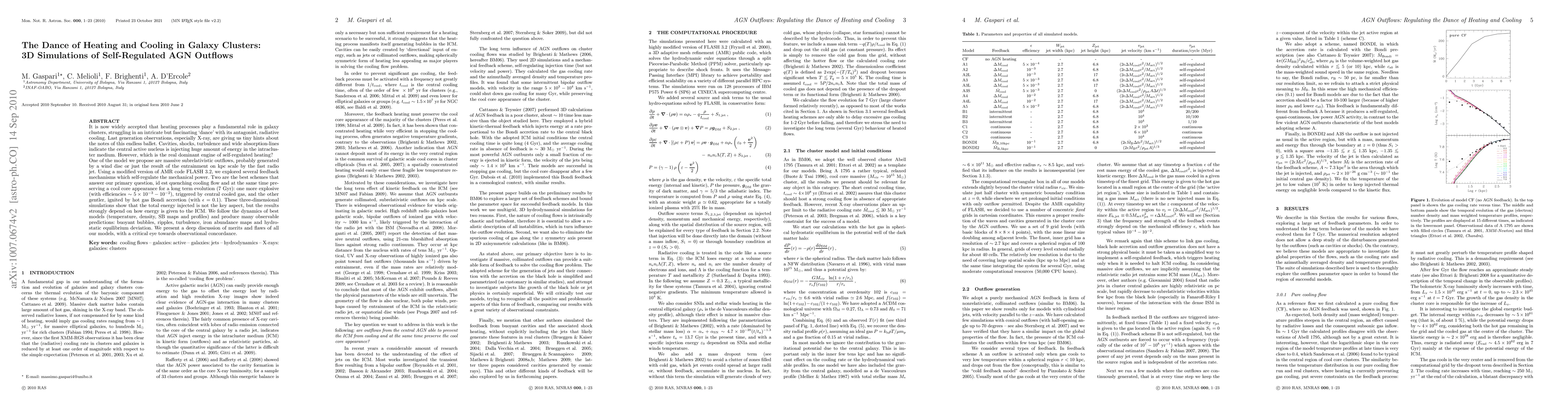 It is now widely accepted that heating processes play a fundamental role in galaxy clusters, struggling in an intricate but fascinating `dance' with its antagonist, radiative cooling. Last generation observations, especially X-ray, are giving us tiny hints about the notes of this endless ballet. Cavities, shocks, turbulence and wide absorption-lines indicate the central active nucleus is injecting huge amount of energy in the intracluster medium. However, which is the real dominant engine of self-regulated heating? One of the model we propose are massive subrelativistic outflows, probably generated by a wind disc or just the result of the entrainment on kpc scale by the fast radio jet. Using a modified version of AMR code FLASH 3.2, we explored several feedback mechanisms which self-regulate the mechanical power. Two are the best schemes that answer our primary question, id est quenching cooling flow and at the same time preserving a cool core appearance for a long term evolution (7 Gyr): one more explosive (with efficiencies 0.005 - 0.01), triggered by central cooled gas, and the other gentler, ignited by hot gas Bondi accretion (with efficiency 0.1). These three-dimensional simulations show that the total energy injected is not the key aspect, but the results strongly depend on how energy is given to the ICM. We follow the dynamics of best model (temperature, density, SB maps and profiles) and produce many observable predictions: buoyant bubbles, ripples, turbulence, iron abundance maps and hydrostatic equilibrium deviation. We present a deep discussion of merits and flaws of all our models, with a critical eye towards observational concordance.