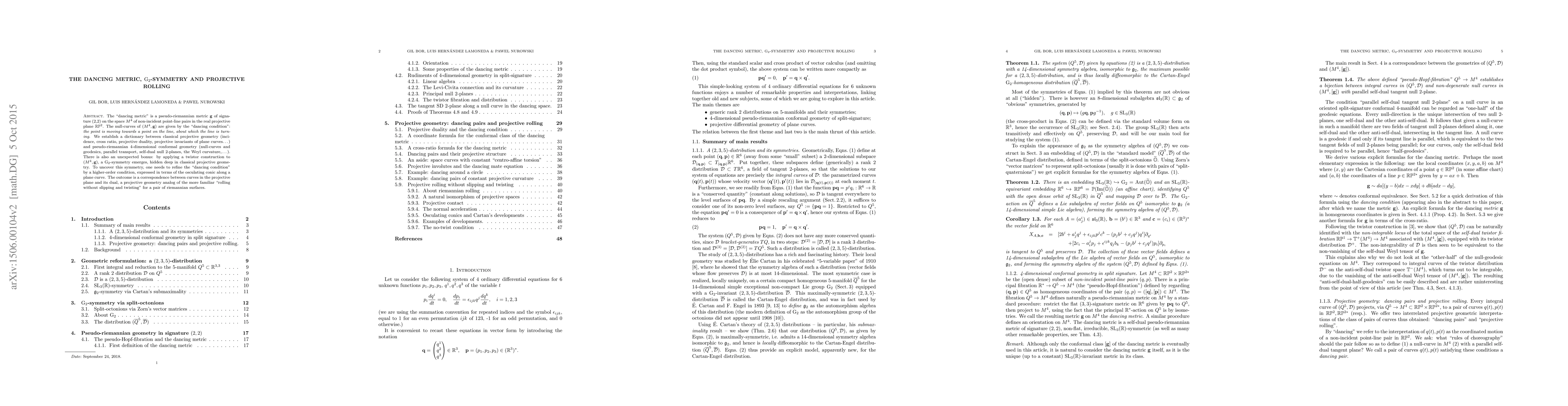 The "dancing metric" is a pseudo-riemannian metric $\pmb{g}$ of signature $(2,2)$ on the space $M^4$ of non-incident point-line pairs in the real projective plane $\mathbb{RP}^2$. The null-curves of $(M^4,\pmb{g})$ are given by the "dancing condition": the point is moving towards a point on the line, about which the line is turning. We establish a dictionary between classical projective geometry (incidence, cross ratio, projective duality, projective invariants of plane curves...) and pseudo-riemannian 4-dimensional conformal geometry (null-curves and geodesics, parallel transport, self-dual null 2-planes, the Weyl curvature,...). There is also an unexpected bonus: by applying a twistor construction to $(M^4,\pmb{g})$, a $\mathrm G_2$-symmetry emerges, hidden deep in classical projective geometry. To uncover this symmetry, one needs to refine the "dancing condition" by a higher-order condition, expressed in terms of the osculating conic along a plane curve. The outcome is a correspondence between curves in the projective plane and its dual, a projective geometry analog of the more familiar "rolling without slipping and twisting" for a pair of riemannian surfaces.