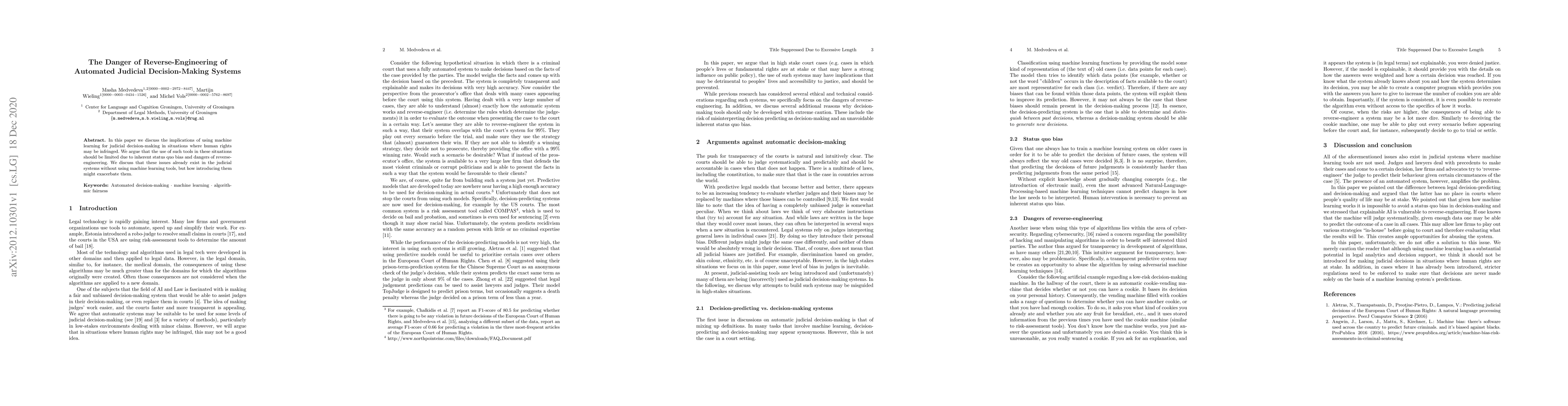 In this paper we discuss the implications of using machine learning for judicial decision-making in situations where human rights may be infringed. We argue that the use of such tools in these situations should be limited due to inherent status quo bias and dangers of reverse-engineering. We discuss that these issues already exist in the judicial systems without using machine learning tools, but how introducing them might exacerbate them.