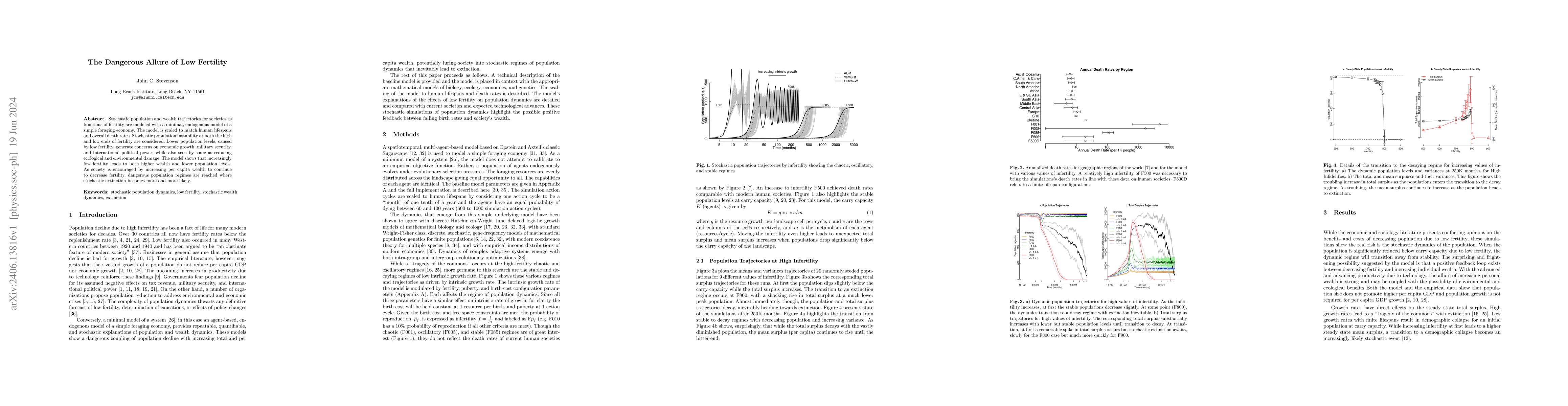 Stochastic population and wealth trajectories for societies as functions of fertility are modeled with a minimal, endogenous model of a simple foraging economy. The model is scaled to match human lifespans and overall death rates. Stochastic population instability at both the high and low ends of fertility are considered. Lower population levels, caused by low fertility, generate concerns on economic growth, military security, and international political power; while also seen by some as reducing ecological and environmental damage. The model shows that increasingly low fertility leads to both higher wealth and lower population levels. As society is encouraged by increasing per capita wealth to continue to decrease fertility, dangerous population regimes are reached where stochastic extinction becomes more and more likely.