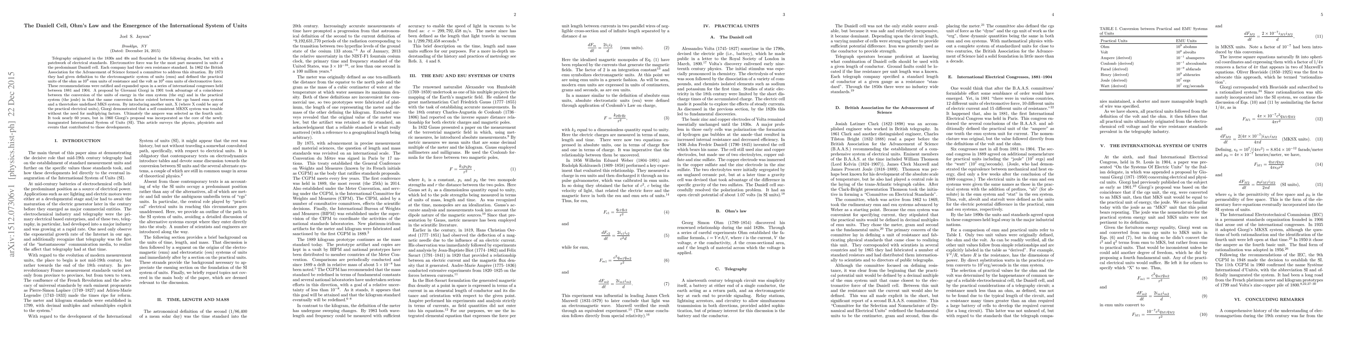 Telegraphy originated in the 1830s and 40s and flourished in the following decades, but with a patchwork of electrical standards. Electromotive force was for the most part measured in units of the predominant Daniell cell. Each company had their own resistance standard. In 1862 the British Association for the Advancement of Science formed a committee to address this situation. By 1873 they had given definition to the electromagnetic system of units (emu) and defined the practical units of the ohm as ${10}^9$ emu units of resistance and the volt as ${10}^8$ emu units of electromotive force. These recommendations were ratified and expanded upon in a series of international congresses held between 1881 and 1904. A proposal by Giovanni Giorgi in 1901 took advantage of a coincidence between the conversion of the units of energy in the emu system (the erg) and in the practical system (the joule) in that the same conversion factor existed between the cgs based emu system and a theretofore undefined MKS system. By introducing another unit, X (where X could be any of the practical electrical units), Giorgi demonstrated that a self consistent MKSX system was tenable without the need for multiplying factors. Ultimately the ampere was selected as the fourth unit. It took nearly 60 years, but in 1960 Giorgi's proposal was incorporated as the core of the newly inaugurated International System of Units (SI). This article surveys the physics, physicists and events that contributed to those developments.
