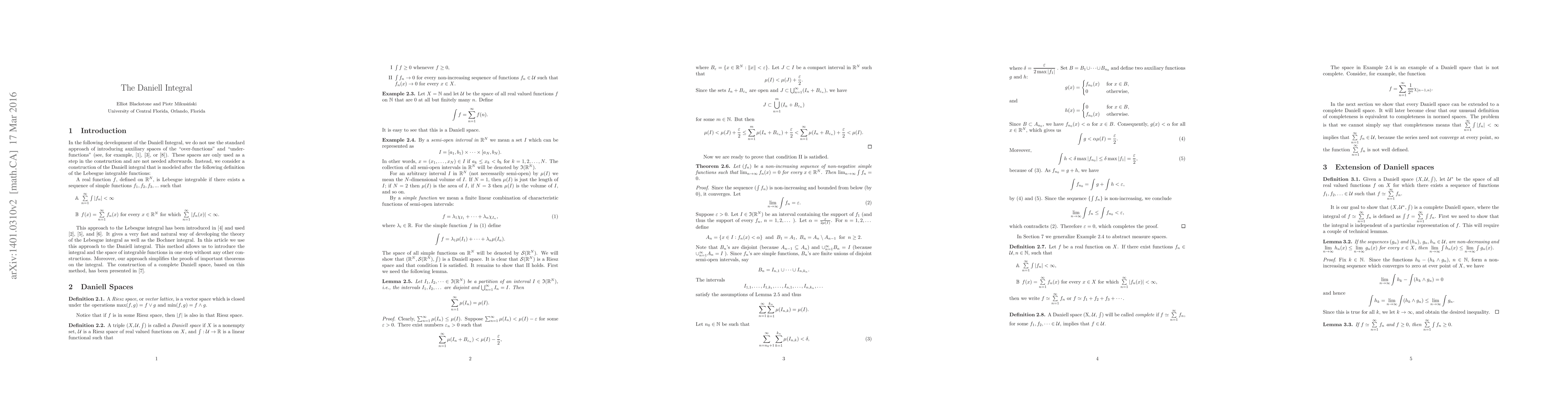 The basic properties of the Daniell integral are presented. We do not use the standard approach of introducing auxiliary spaces of the "over-functions" and "under-functions." Instead, we use a simple and direct approach based on approximating integrable functions by absolutely convergent series of simple functions.