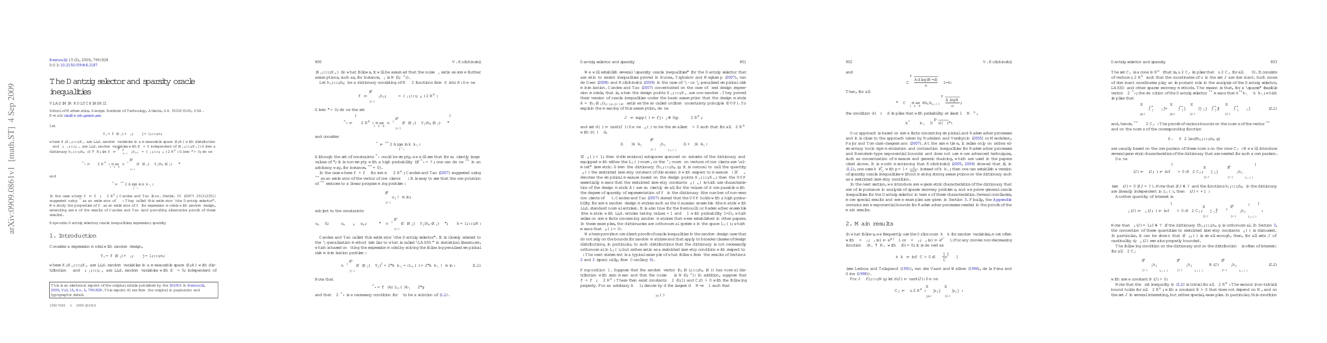 Let \[Y_j=f_*(X_j)+\xi_j,\qquad j=1,...,n,\] where $X,X_1,...,X_n$ are i.i.d. random variables in a measurable space $(S,\mathcal{A})$ with distribution $\Pi$ and $\xi,\xi_1,... ,\xi_n$ are i.i.d. random variables with ${\mathbb{E}}\xi=0$ independent of $(X_1,...,X_n).$ Given a dictionary $h_1,...,h_N:S\mapsto{\mathbb{R}},$ let $f_{\lambda}:=\sum_{j=1}^N\lambda_jh_j$, $\lambda=(\lambda_1,...,\lambda_N)\in{\mathbb{R}}^N.$ Given $\varepsilon>0,$ define \[\hat{\Lambda}_{\varepsilon}:=\Biggl\{\lam bda\in{\mathbb{R}}^N:\max_{1\leq k\leq N}\Biggl|n^{-1}\sum_{j=1}^n\big l(f_{\lambda}(X_j)-Y_j\bigr)h_k(X_j)\Biggr|\leq\varepsilon \Biggr\}\] and \[\hat{\lambda}:=\hat{\lambda}^{\varepsilon}\in \operatorname {Arg min}\limits_{\lambda\in\hat{\Lambda}_{\varepsilon}}\|\lambda\|_{\ell_1}.\] In the case where $f_*:=f_{\lambda^*},\lambda^*\in {\mathbb{R}}^N,$ Candes and Tao [Ann. Statist. 35 (2007) 2313--2351] suggested using $\hat{\lambda}$ as an estimator of $\lambda^*.$ They called this estimator ``the Dantzig selector''. We study the properties of $f_{\hat{\lambda}}$ as an estimator of $f_*$ for regression models with random design, extending some of the results of Candes and Tao (and providing alternative proofs of these results).