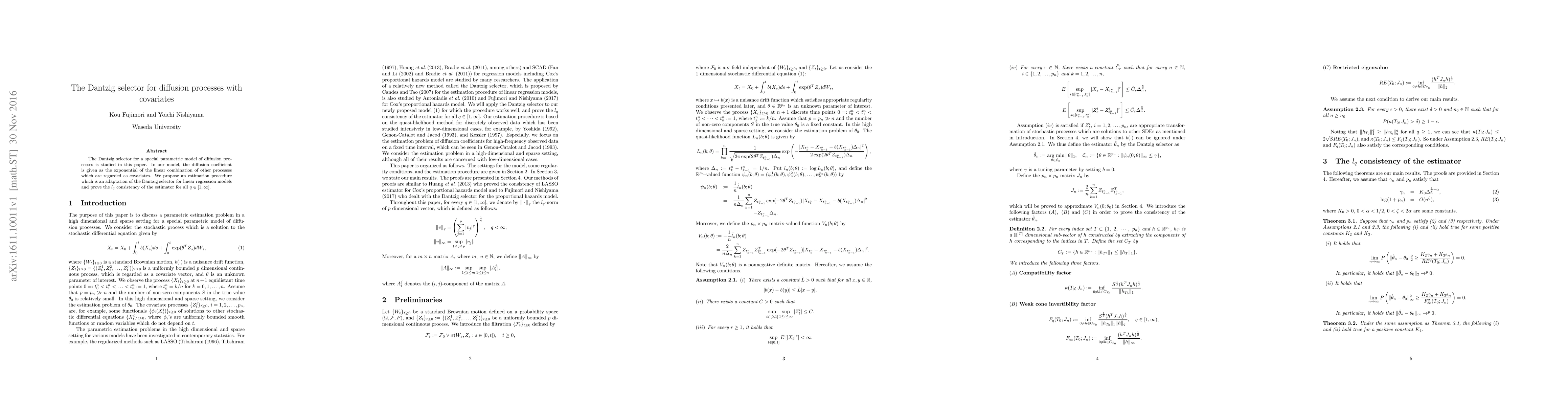This paper proposes an adaptation of the Dantzig selector for estimating parameters in a diffusion process model where the diffusion coefficient is an exponential function of covariates. The authors prove $l_q$ consistency for the estimator across all $q \in [1,\infty]$.