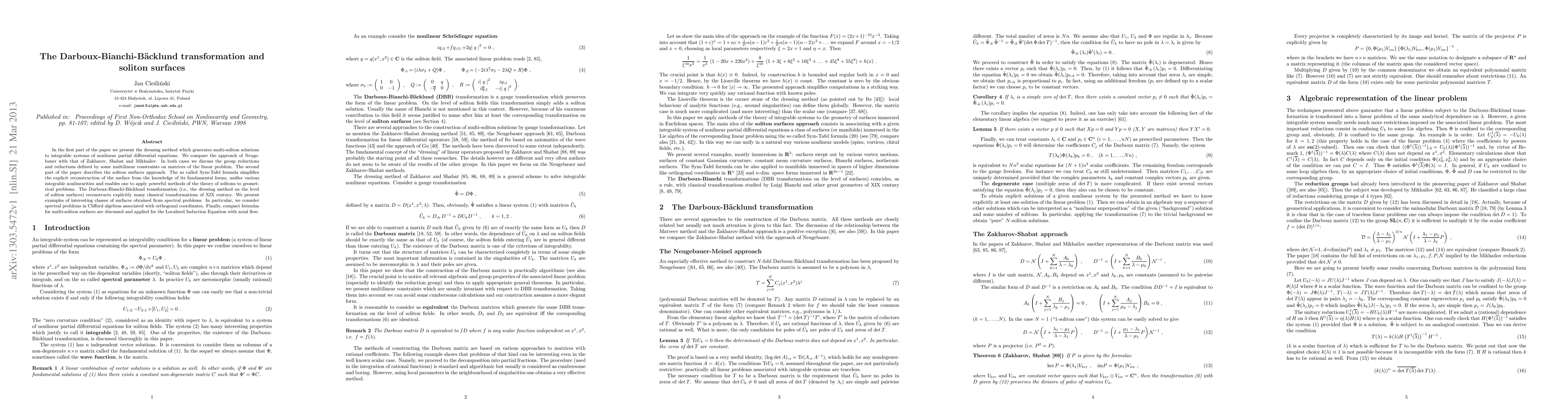 This paper explores the Darboux-Bianchi-Bäcklund transformation via the dressing method for generating multi-soliton solutions in integrable nonlinear PDEs, comparing Neugebauer's and Zakharov's approaches. It also introduces the soliton surfaces approach, utilizing the Sym-Tafel formula to reconstruct surfaces from fundamental forms and apply soliton theory to geometric problems.