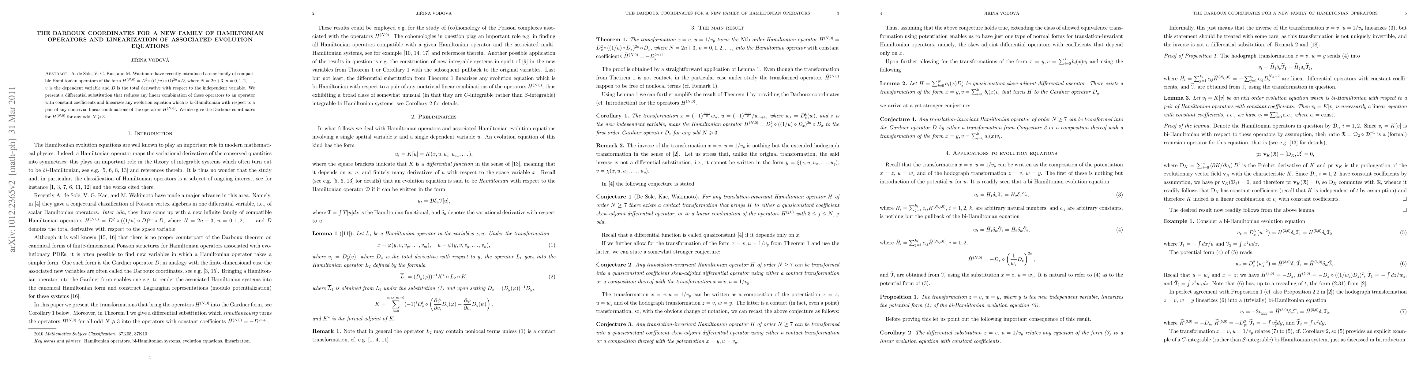 A. de Sole, V. G. Kac, and M. Wakimoto (arXiv:1004.5387) have recently introduced a new family of compatible Hamiltonian operators of the form $H^{(N,0)}=D^2\circ((1/u)\circ D)^{2n}\circ D$, where $N=2n+3$, $n=0,1,2,...$, $u$ is the dependent variable and $D$ is the total derivative with respect to the independent variable. We present a differential substitution that reduces any linear combination of these operators to an operator with constant coefficients and linearizes any evolution equation which is bi-Hamiltonian with respect to a pair of any nontrivial linear combinations of the operators $H^{(N,0)}$. We also give the Darboux coordinates for $H^{(N,0)}$ for any odd $N\geqslant 3$.